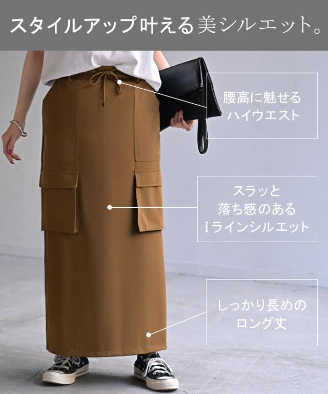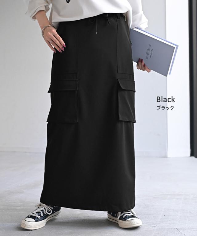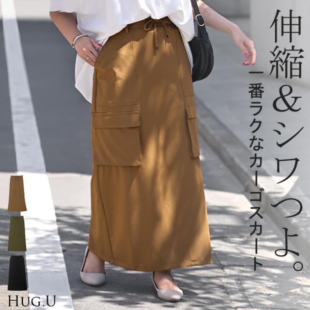 スカート レディース ボトムス カーゴ カーゴスカート Iライン ロングスカート マキシ ウエストゴム ポケット 無地 ゆったり ミリタリー ナイロン ロング 長い 体型カバー ハイウエスト アウトドア おしゃれ 大きいサイズ 黒 カーキ 秋 夏 HUG.U 秋新作