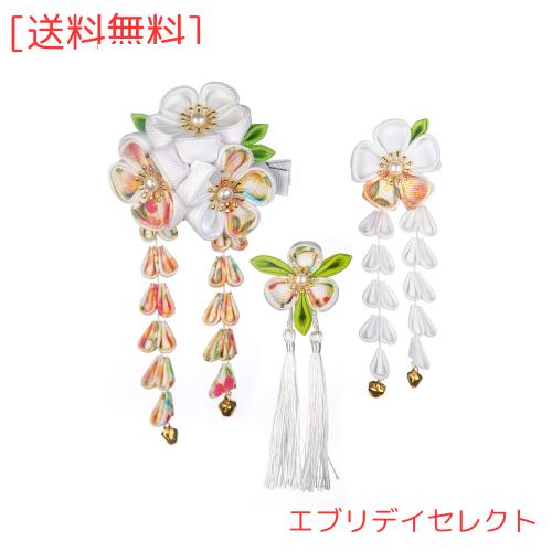 [JZOON] 髪飾り3点セット 成人式 七五三 浴衣 袴 着物 振袖 和装 つまみ細工 花 卒業式 結婚式 鈴付き 手作り 白C 5色全15選