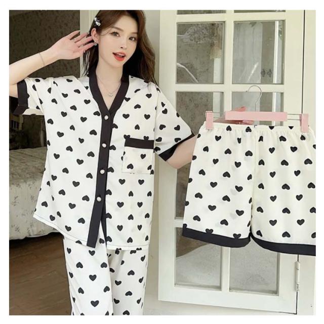| M-3XL!前開きパジャマ 半袖トップス・ショートパンツ・ロングパンツの3点セットです。 普段使いだけでなく入院時にも便利な前開きタイプです。トップスはボタン仕様で、着脱しやすいです。 ボトムスは伸縮性ウエストゴム仕様で、締め付け感がありません。 柔らかい肌触りで着心地も抜群。 大人可愛いデザインのパジャマ3点セットです。 カジュアル風デザインですので、家にいるときは勿論、ちょっとお出かけも活躍できます。 | |