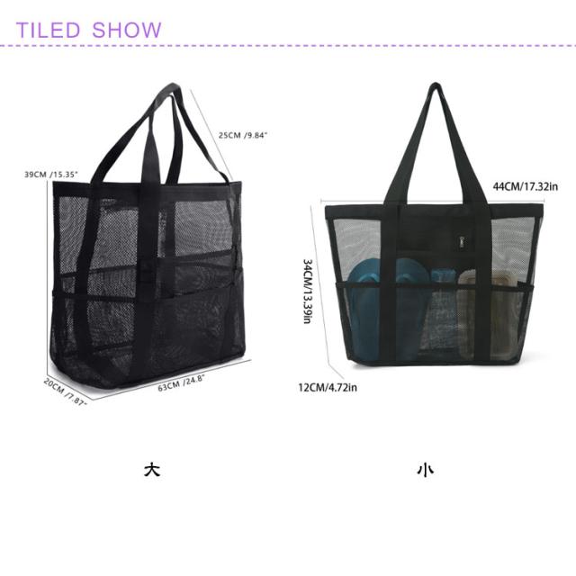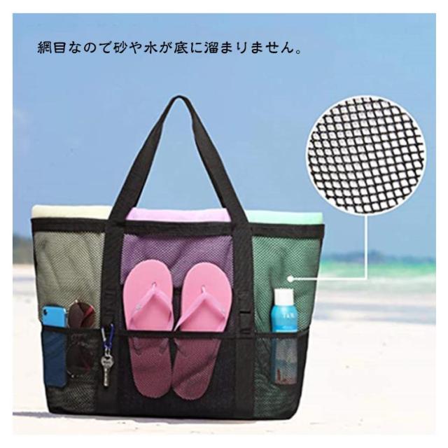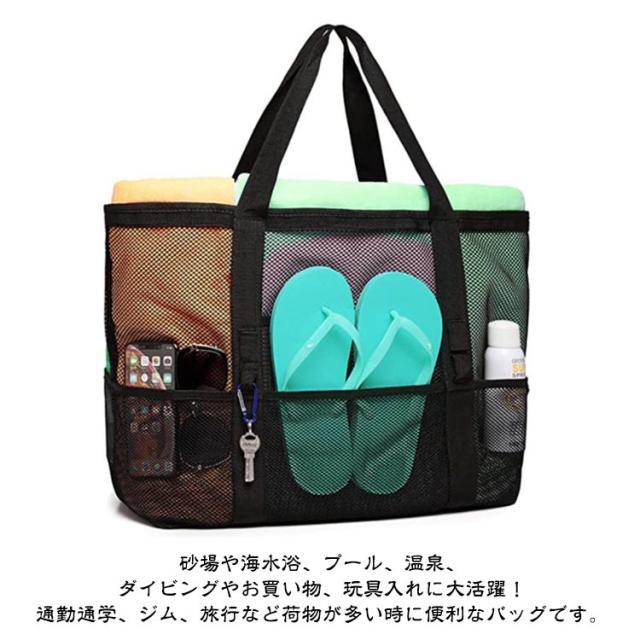 | 大容量のメッシュトートバッグです。砂場や海水浴、プール、温泉、ダイビングやお買い物、玩具入れに大活躍!通勤通学、ジム、旅行など荷物が多い時に便利なバッグです。 多ポケット、内部にファスナーポケットがあります。持ちやすいハンドルです。肩掛けもできる大型トートバッグです。 大き目ですが軽量でコンパクトに折り畳みできるトートので旅行や海など外出用に携帯できます。 網目なので砂や水が底に溜まりません。 丈夫なポリエステルオックスフォード生地です。メッシュ素材のトートは水に濡れても乾きやすいです。ご家庭で洗えます。 | |