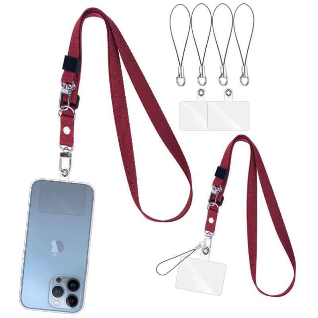 [Olliwon] スマホストラップ 首掛け 携帯ストラップ, 15mm幅平型のヒモ ネックストラップ 2本+透明タグパッチ2枚入り+リング付きストラップ4本 ショルダーストラップ 肩掛け 斜めがけ 長さ調整可能 スマホ破損 紛失予防に 全機種対応 (ワインレッド)