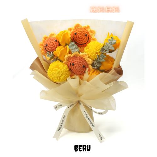 「製品特徴」1.笑顔向日葵の編み技術は北京冬季オリンピック大会での授賞ブーケと同じ、「上海流ウール編み技術」を採用されています。我々の編みチームにより、一つ一つ編まれました。2.重々しい感じを避けるのには、高級のクラフト紙とソルビン紙で梱包され、ソルビン紙は非常に軽くて柔らかく、つるつるで大きさもちょうどいいです。持ち運びが大変便利です。