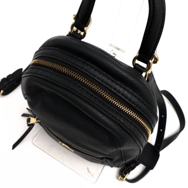 落ち着きのあるシボ感の美しいペブルドレザー、フロント部分の金具ロゴやファスナータブの結び目飾りがアクセントを添えます。ベルトの付け変えにより、ショルダーバッグとしてもお使い頂け、ちょっとしたお出かけにも最適なアイテムです。