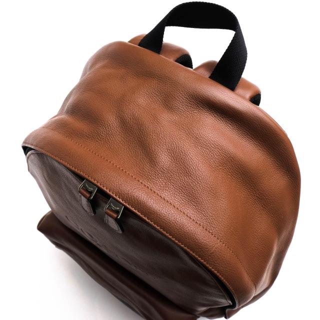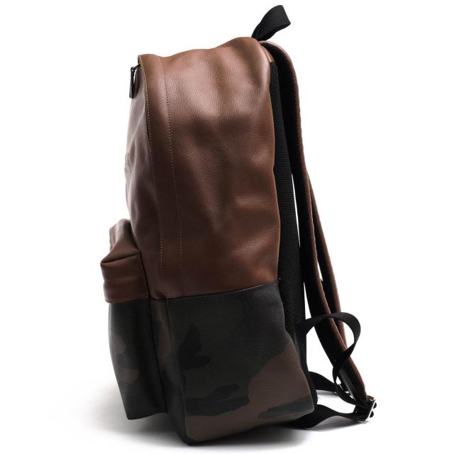 カモフラージュ柄のPVCコーティングキャンバス生地にコーチ定番のペブルドレザーを合わせたデイパック。定番の形で、内部にはファスナーポケット1つとオープンポケット4つがあり、外部にも便利なファスナーポケットが1つついています。A4サイズのアイテムも収納できる広々とした内部空間で、日常使いはもちろん、旅行などのシーンにも適しています。