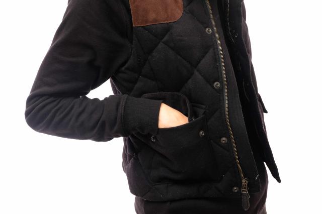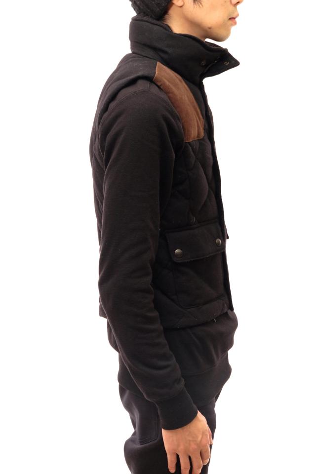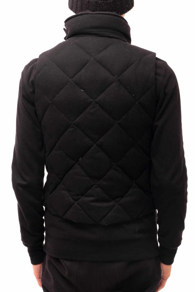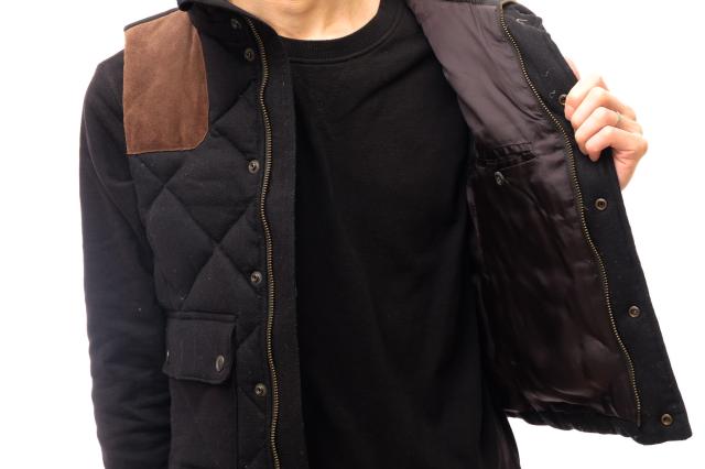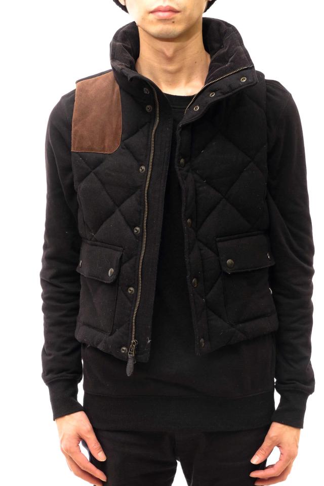 カシミヤブレンドのウール素材に、スエードレザーを切り替えた、キルティングのダウンベスト。ショート丈で幅広いシーンで活躍します。