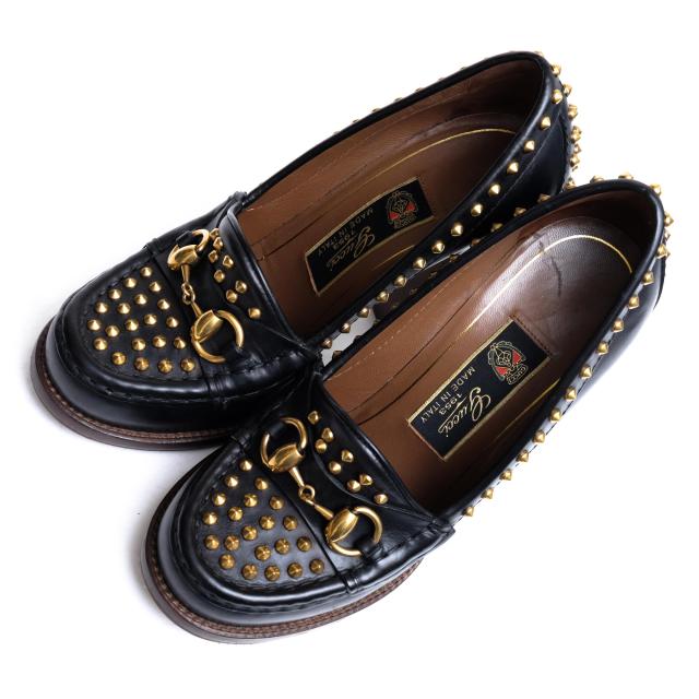 グッチを象徴するホースビットが輝き、ハードなスタッズを施したスパイシーなパンプス。高めのヒールが大人っぽいデザインで、ファッションのポイントになる一足です。