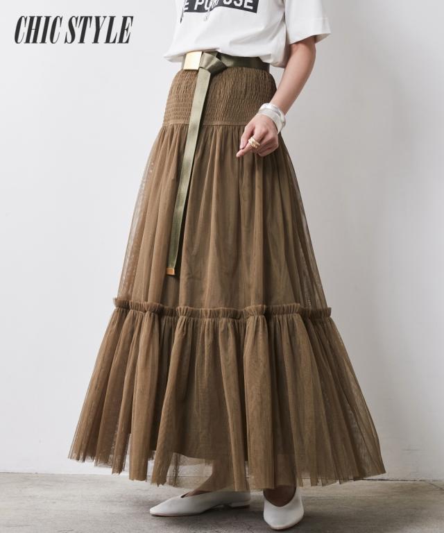 チュールマキシギャザースカート(ペチスカート付) シックスタイル(大きいサイズ対応)