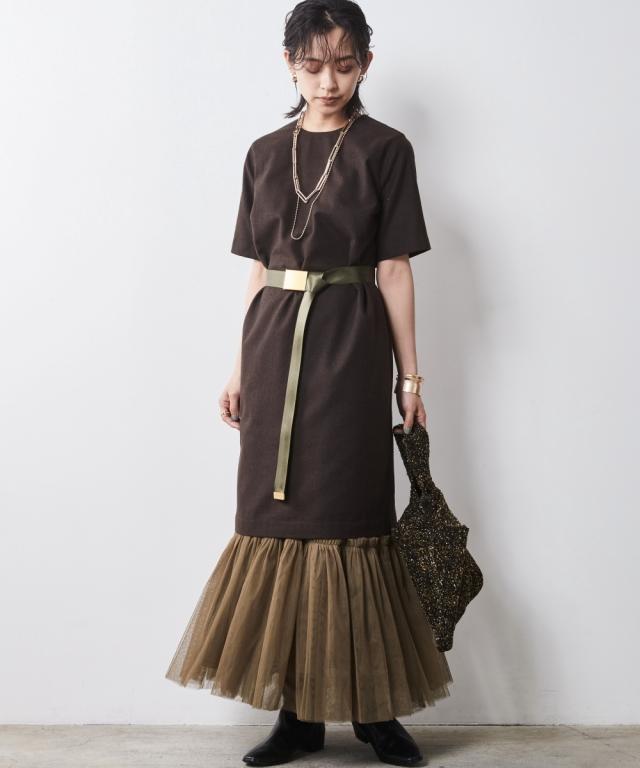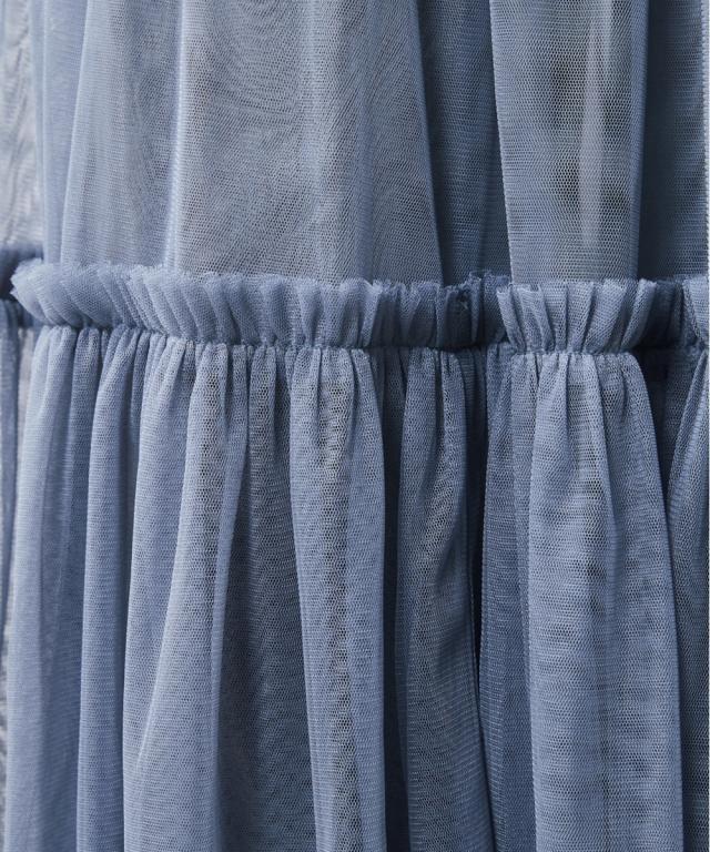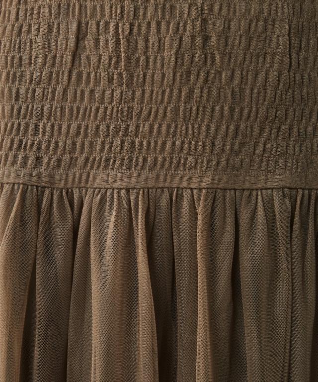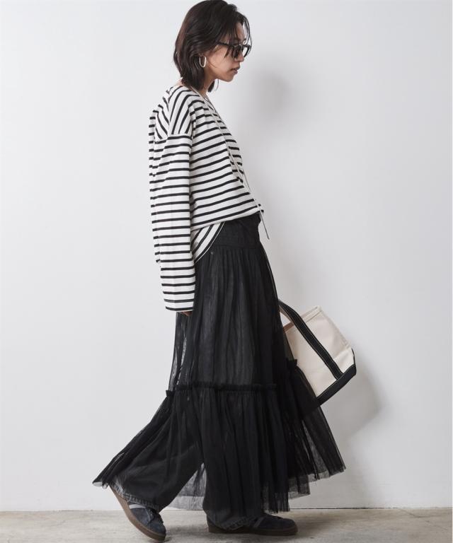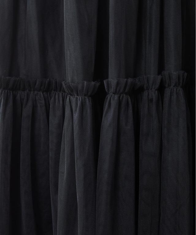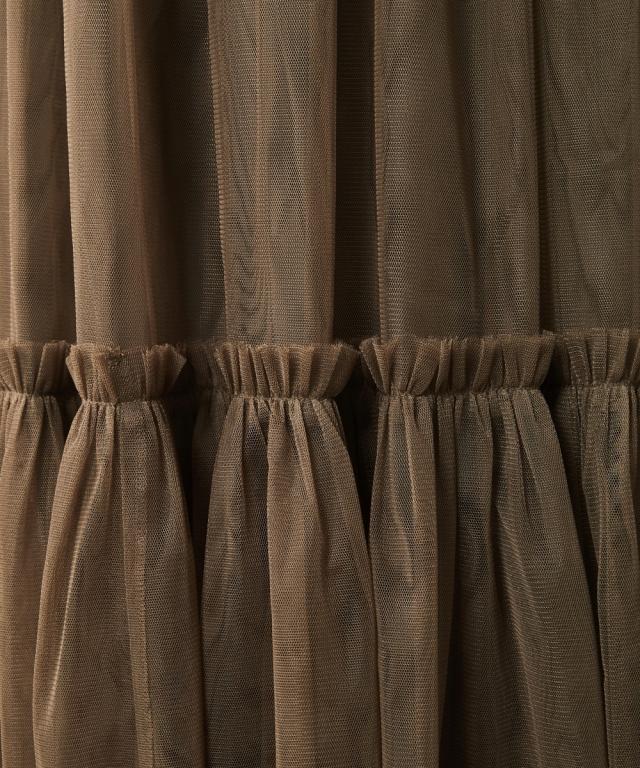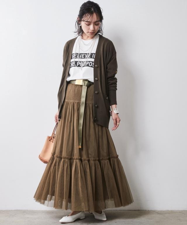 たっぷり贅沢にチュール素材を使用したギャザーロングスカート。 ■デザイン ウエストは幅広いゴムシャーリング仕様ですっきり、ひざ下位置で切り替えを入れ、ギャザーをたっぷり加えることで裾にボリュームを持たせた、シルエットのこだわったスカート。 裏地付きでなくペチコート付きなので、ペチコートを外してレイヤードスタイルも楽しめます。 ■素材 ソフトなチュール素材を使用。 ■おすすめのスタイリング スカートとしてはもちろん、パンツとレイヤードとしたカジュアルミックスなスタイルなどレイヤードスタイルを楽しめる一着です。