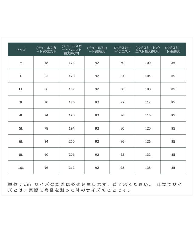 品質:〈チュールスカート・ペチスカート〉ポリエステル100% チュールスカートは透けますので、付属のペチスカートやパンツなどをご着用ください。引っかかりにご注意ください。この商品は2点同サイズのみで販売します。