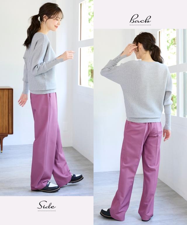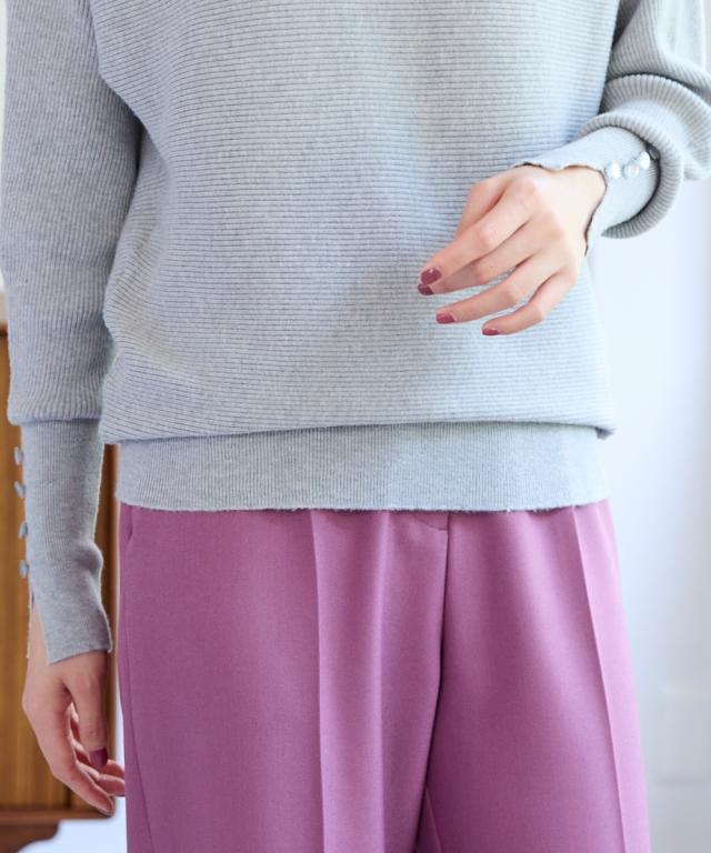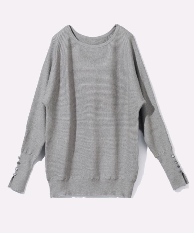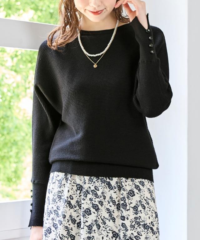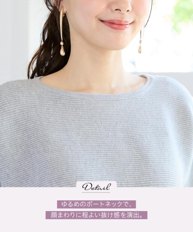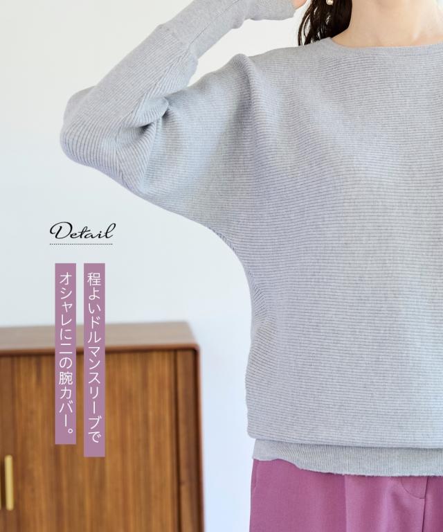 横リブ×ドルマンが生み出す、ゆったりと美しいシルエット。 ■デザイン 首回りは美しいネックラインを魅せるボートネック.肩の切り替えがないので二の腕のラインもさりげなくカバーし、ゆるっと女性らしい表情を作ってくれます。袖口のスリット&ボタンが抜け感と大人の甘さを演出してくれます。 ■素材 チクチクしない滑らかで心地よい肌触りです。横リブで表面感があり奥行き感を演出。伸縮性もあるので締め付け感もありません。 ■おすすめのスタイリング 細部のディテールにこだわったシンプルニットは、ロングTシャツのように気軽にコーデに取り入れやすく、カットソーやトレーナー感覚で着用して頂けます。ジーンズはもちろん、どんなボトムスとも合うシンプルなデザイン&カラーが着回し力抜群です。
