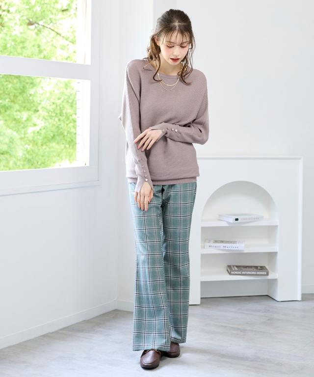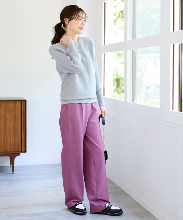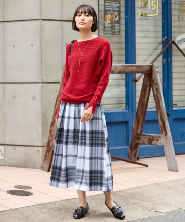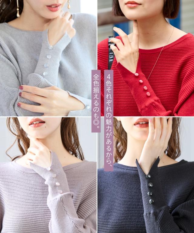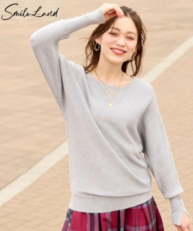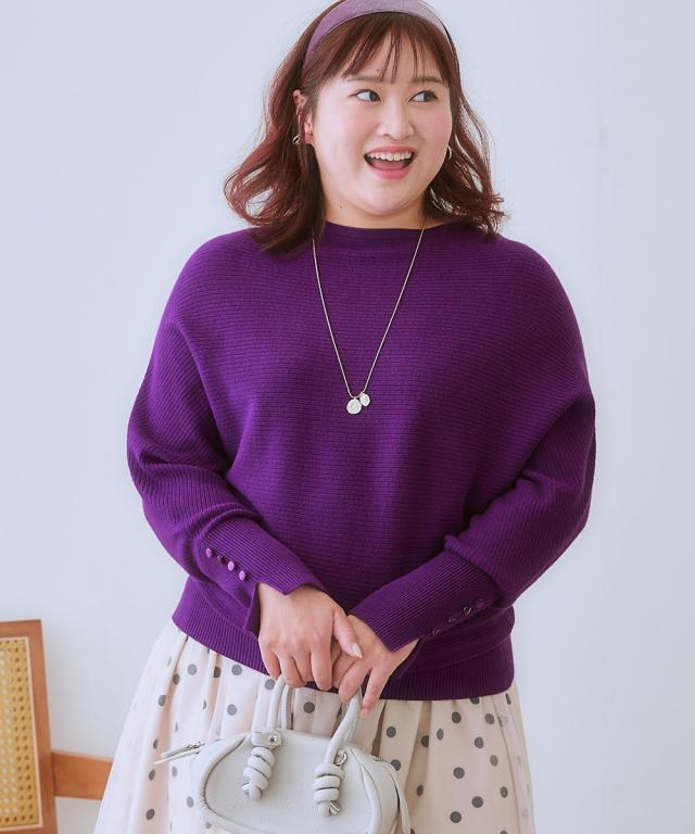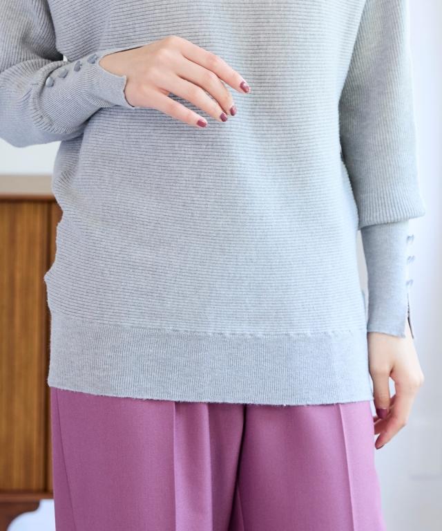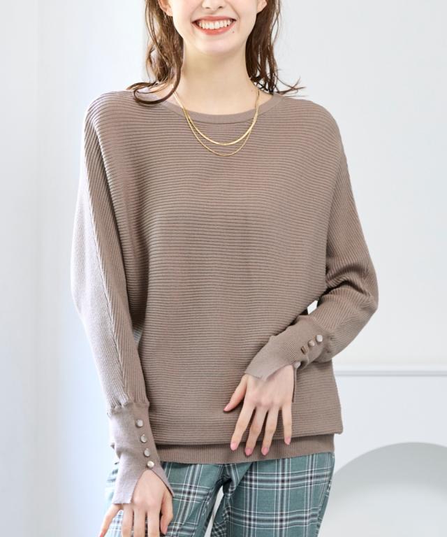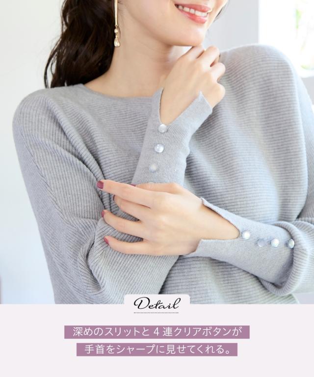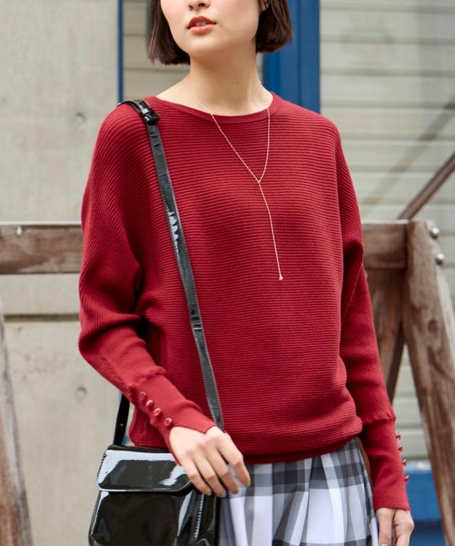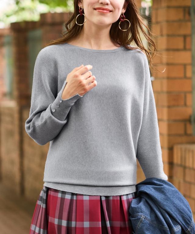 横リブ×ドルマンが生み出す、ゆったりと美しいシルエット。 ■デザイン 首回りは美しいネックラインを魅せるボートネック.肩の切り替えがないので二の腕のラインもさりげなくカバーし、ゆるっと女性らしい表情を作ってくれます。袖口のスリット&ボタンが抜け感と大人の甘さを演出してくれます。 ■素材 チクチクしない滑らかで心地よい肌触りです。横リブで表面感があり奥行き感を演出。伸縮性もあるので締め付け感もありません。 ■おすすめのスタイリング 細部のディテールにこだわったシンプルニットは、ロングTシャツのように気軽にコーデに取り入れやすく、カットソーやトレーナー感覚で着用して頂けます。ジーンズはもちろん、どんなボトムスとも合うシンプルなデザイン&カラーが着回し力抜群です。