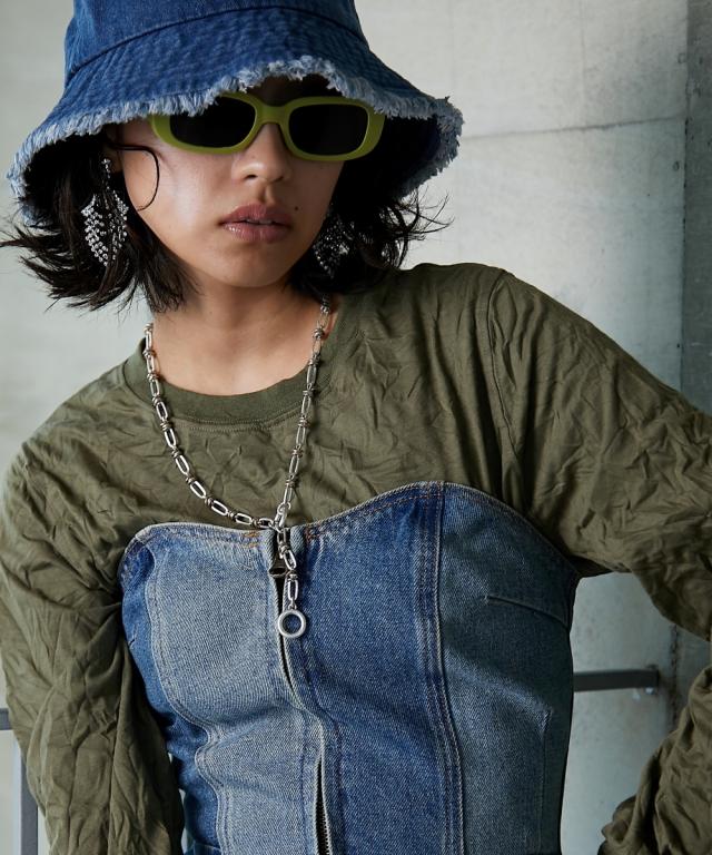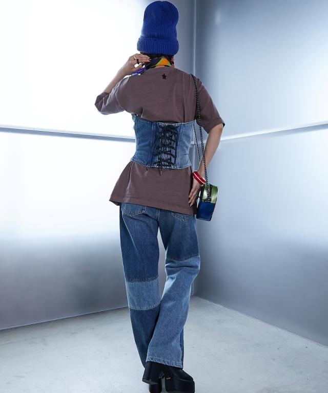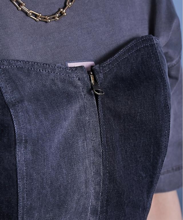 今季トレンドのビスチェがデニムで登場。 ■デザイン トレンドのフロントジップディテールがポイント。 ダーツやパネル切り替えにステッチワークを効かせ、立体感のある表情に仕上げました。 濃淡のデニムを使用したパッチワークデザインもポイント。 後はゴムシャーリングとレースアップディテールで自分のサイズに調節可能です。 ■素材 綿100%11.5オンスのデニム素材を使用。 ■おすすめのスタイリング Tシャツやワンピースとのレイヤードスタイルが楽しめます。 同素材のパッチワークデニムとのセットアップ着用もおすすめ 。 コーディネートのアクセントにぴったりのアイテムです。 ファスナーは上からも下からも開けられるダブルジップを採用しています。 ジップを閉めていただく際は2個のスライダーを下におろしてから閉めてください。 ファスナーのスライダーは下におろすとロックがかかる様になっております。 ジップを上げていただいた後はスライダーを下までおろしてください。