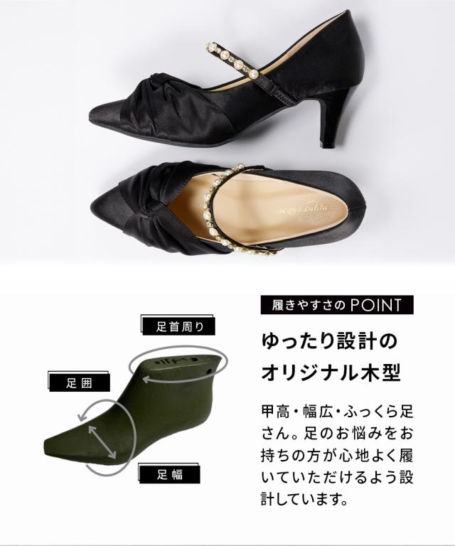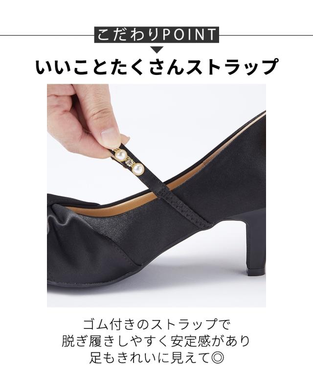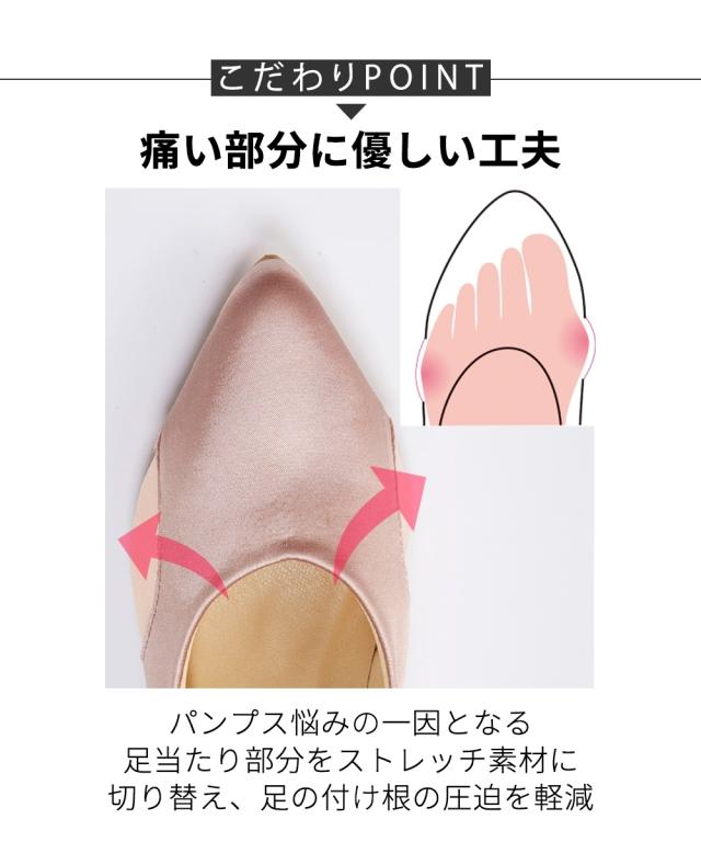 母趾(ぼし)・小趾(しょうし)部分がストレッチのパンプス。パンプスを履くうえで足が痛くなるのを心配されている方がたくさんいらっしゃるので、そんな方でも快適に履いていただけるような商品として開発しました 。外側からはわかりませんが、ターバンの内側の親指と小指の付け根部分がストレッチになっているので、足当たりの窮屈さを緩和してくれます。また、かかと部分にもクッションを入れているので、かかとに優しいのもポイントです。上品な光沢感のある素材とパール調のパーツが華やかなデザインの一足。 ■ポイント ・母趾・小趾部がストレッチで締め付け感軽減 ・低反発中敷きでやさしい履き心地 ・屈曲性のあるやわらかい底材です ・かかとクッションでフィット感のある履き心地 ・ゴム付きベルトで脱ぎ履きしやすく安定感あり ・上品な光沢感のサテン調素材 ・きらりと光るパール調パーツが華やか 【ニッセンオリジナルの大きいサイズ規格】 本当に合う靴に出会った事はありますか ニッセンの4Eは、靴底の幅を広げ、甲や足首周りもゆったりの独自設計。 靴のサイズにお悩みのお客様へ向けて、サイズが大きくてもバランス良くきれいに見えるよう企画したオリジナルシューズです。