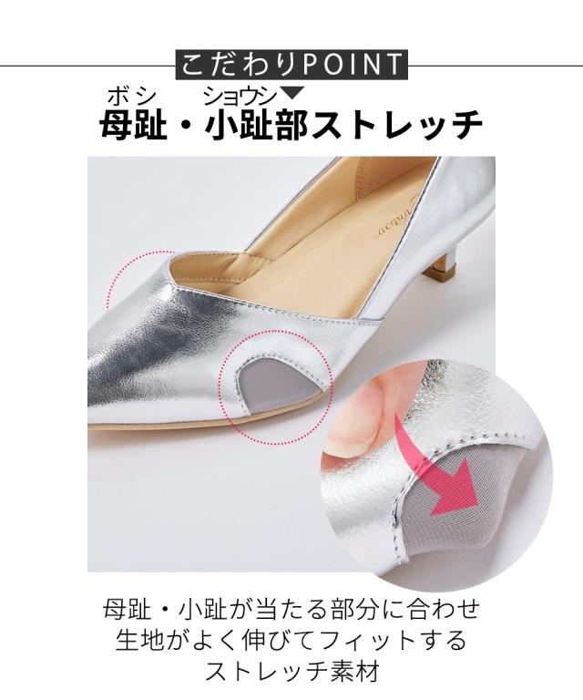 母趾(ぼし)・小趾(しょうし)部分がストレッチのパンプスです。外側からはわかりませんが、リボンの内側の親指と小指の付け根部分がストレッチになっているので、足当たりの窮屈さを緩和してくれます。また、かかと部分にジェルパッドを入れているので、かかとのずれが軽減されるのもポイントです。光沢感のある大きなリボンが華やかなデザインの一足です。 ■ポイント ・母趾・小趾部がストレッチで締め付け感軽減 ・低反発中敷きでやさしい履き心地 ・屈曲性のあるやわらかい底材です ・内側メッシュ素材で足あたりやさしい ・かかとジェルパッドでパカパカしにくい ・光沢感が華やかな素材感 ・履き口をVカットに仕上げる事ですっきりとしたシルエット見え ・大きいリボンでカジュアルにもフェミニンにも組み合わせ自由 【ニッセンオリジナルの大きいサイズ規格】 本当に合う靴に出会った事はありますか ニッセンの4Eは、靴底の幅を広げ、甲や足首周りもゆったりの独自設計。 靴のサイズにお悩みのお客様へ向けて、サイズが大きくてもバランス良くきれいに見えるよう企画したオリジナルシューズです。