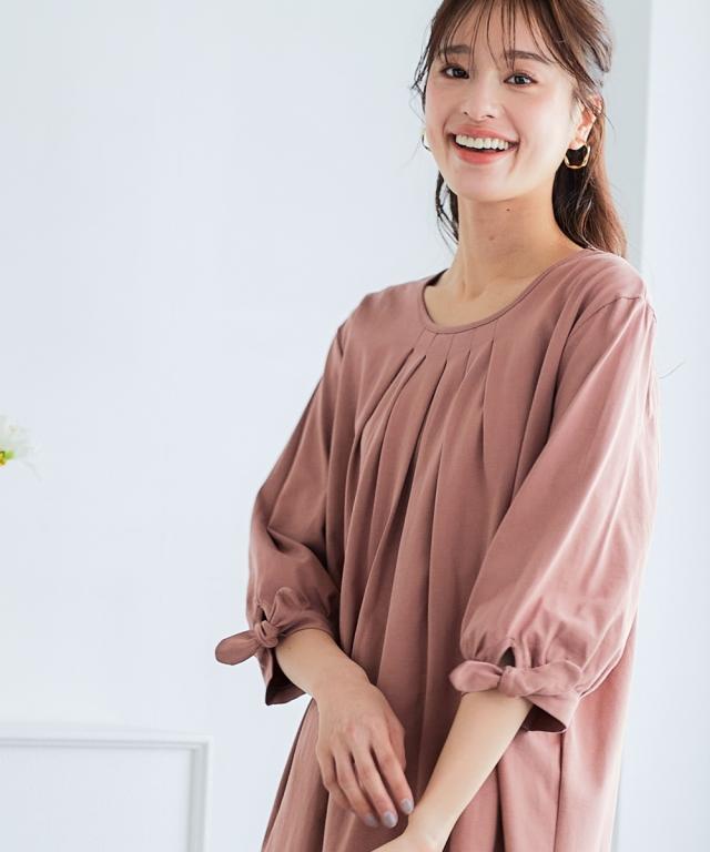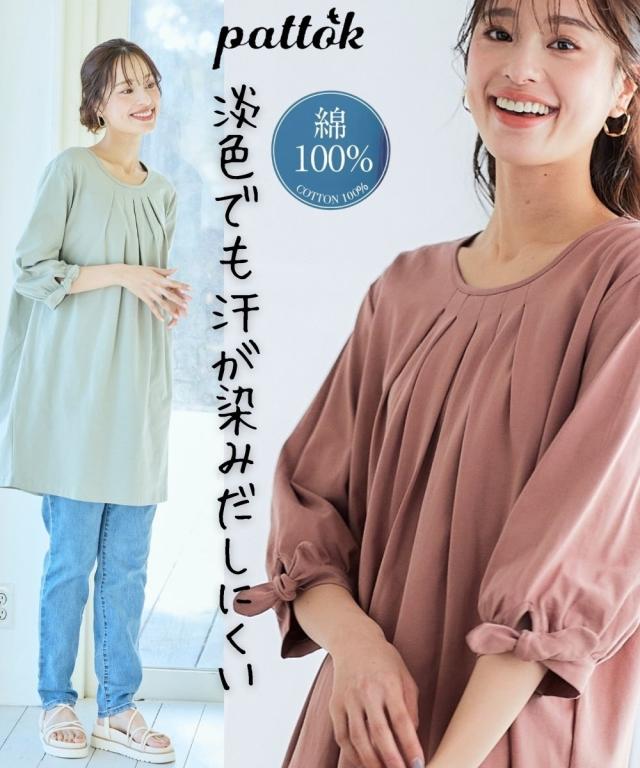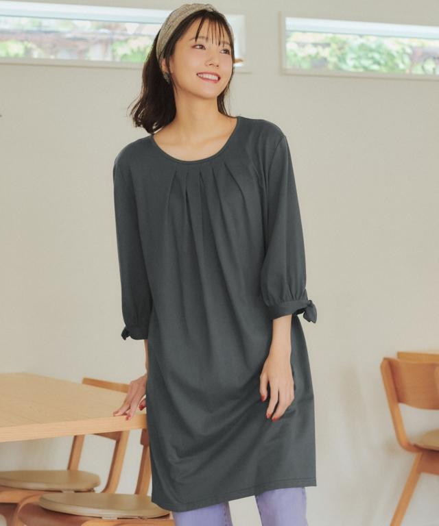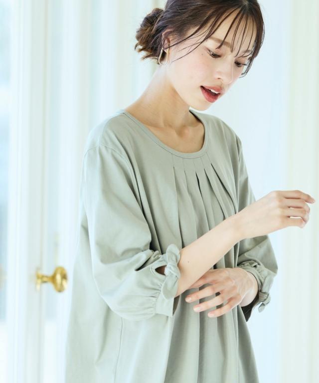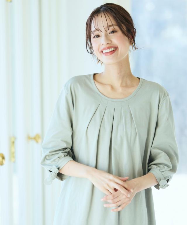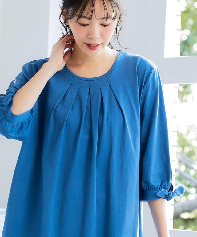 品質=綿100% 袖のリボンは留め付けではございません。 汗染み防止加工を施しておりますが完全に防止するものではありません。また染み具合は本体の色によって異なります。 透け感:なし(淡色は透けやすいのでインナーの着用をおすすめします) 伸縮性:あり 生地の厚み:普通 光沢感:なし 季節:春・夏・秋 シルエット:普通 ※この商品は前身頃にタック・後身頃にギャザーを施しておりサイズ表には両肩を持ち上げ、タック・ギャザーを自然な形で整え、平置き採寸した寸法を記載 原産国:中国製 備考:洗濯機OK ネット使用