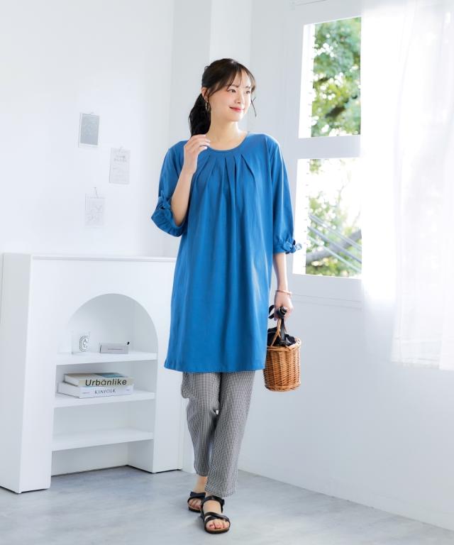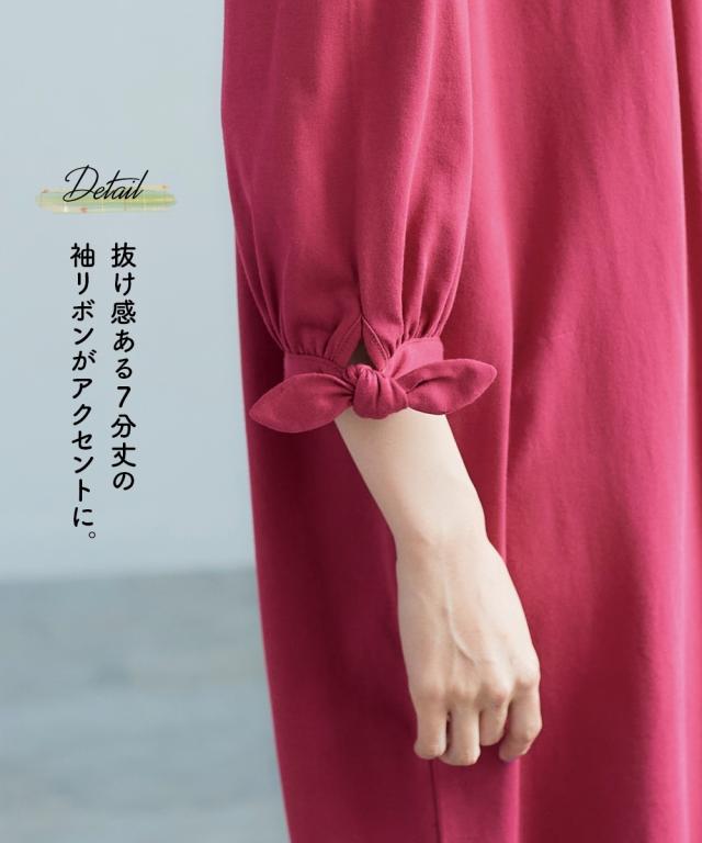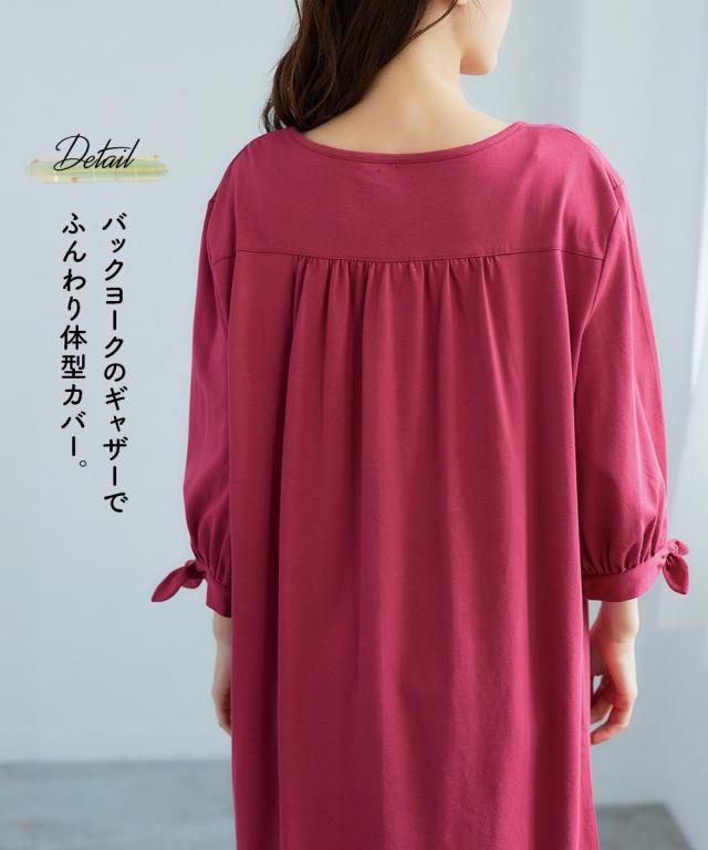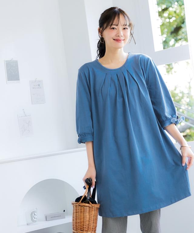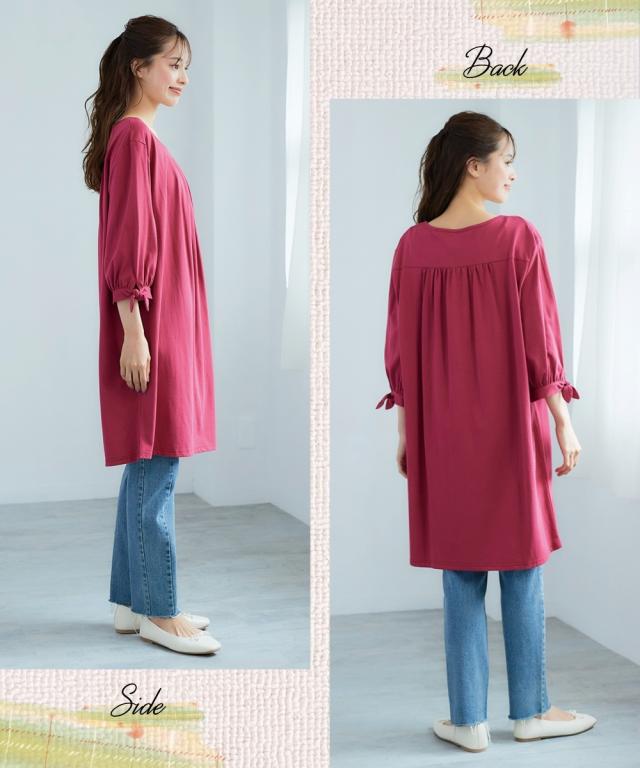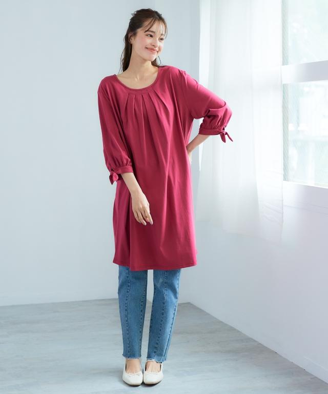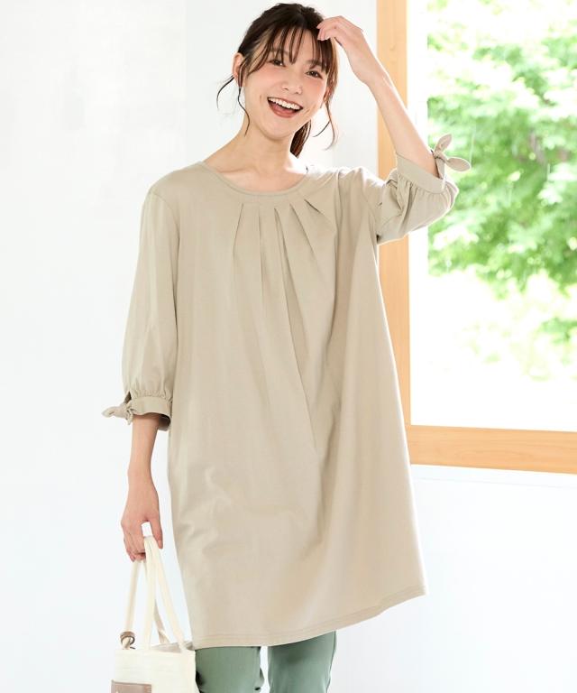 チュニック 大きいサイズ レディース 綿100% 汗染みしにくい7分袖リボン使い カットソー 体型カバー お尻隠れる