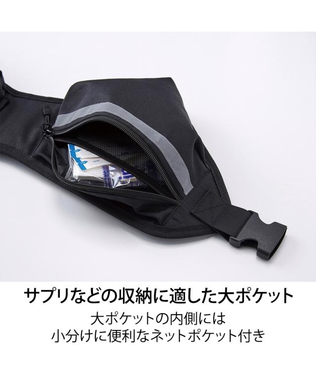 腰に巻いて姿勢がいいウォーキングを 姿勢をよくして快適ウォーキング 。 ウォーキングのときにはポーチが欠かせません。水分補給をしたり、大切な貴重品を持ち歩くことと、両手が自由に使えて、姿勢を意識したウオーキングができるように腰に巻くポーチがおすすめ ポーチのここがポイント クッション性のある広い面でウエストまわりにフィット。ポーチが揺れにくく腰をサポートします。 厚めの幅広クッション内蔵。 裏側はムレにくいメッシュ生地。 食い込みにくい幅広のウエストベルト。 反射テープ付きで夜間の視認性アップ。 はっ水加工(水をはじきやすい)。 落下防止用バンドが付いたペットボトル入れ 収納ポケットにもこだわりポイント スマートフォンやサプリなどの収納に適した大ポケット 鍵や小銭入れに使える小ポケットが2つ。 大ポケットの内側には小分けに便利なネットポケット付き。