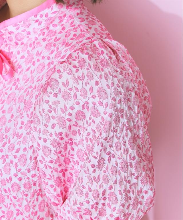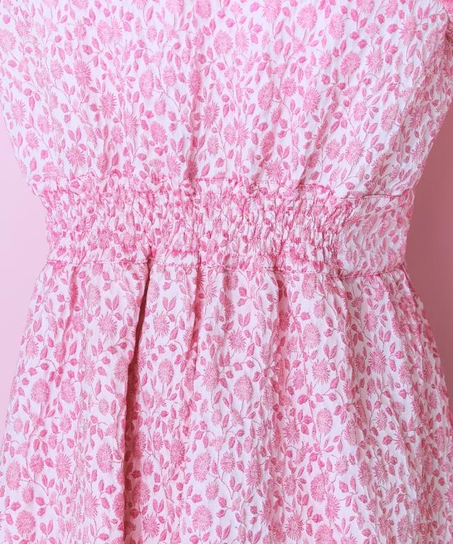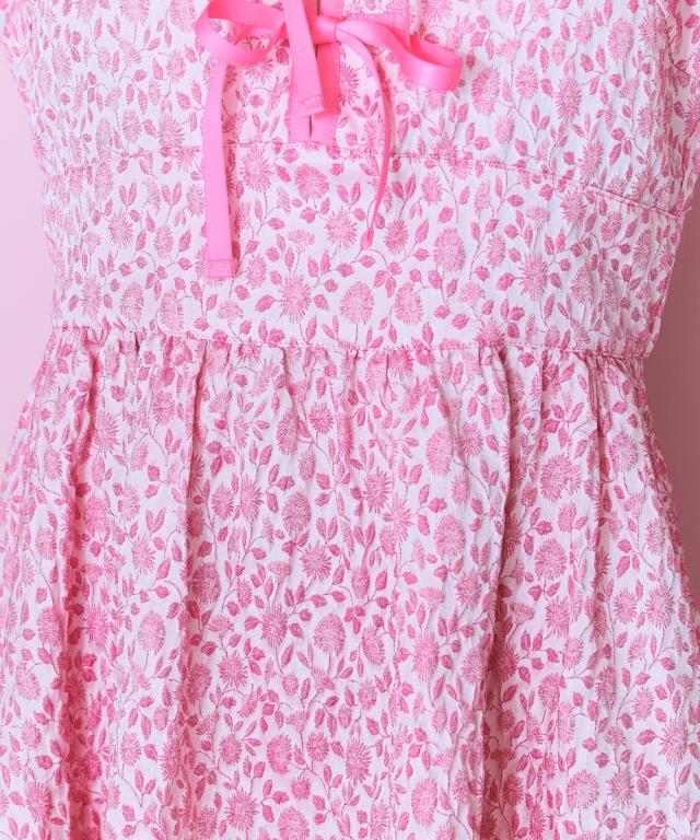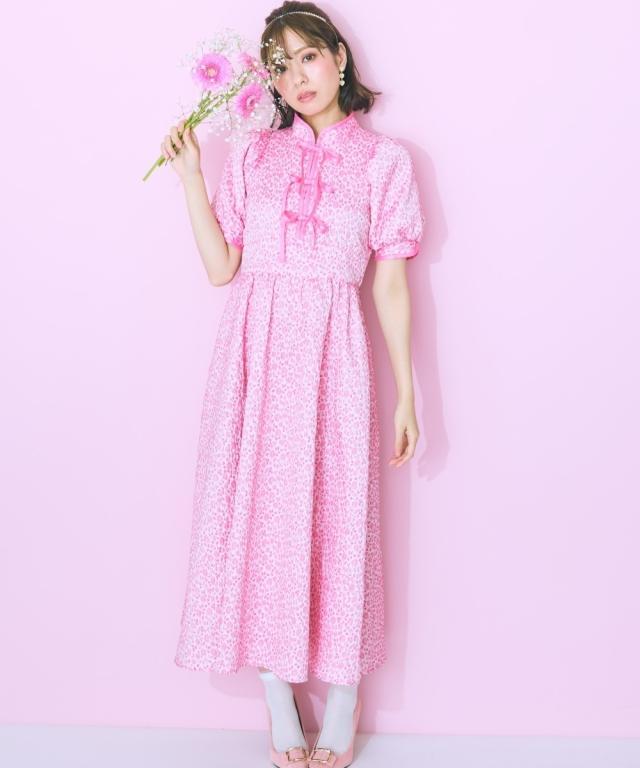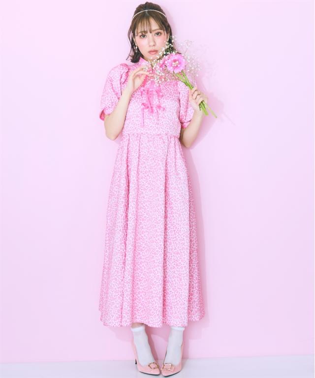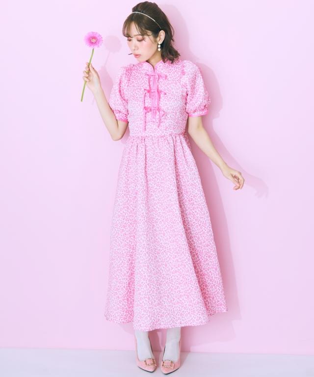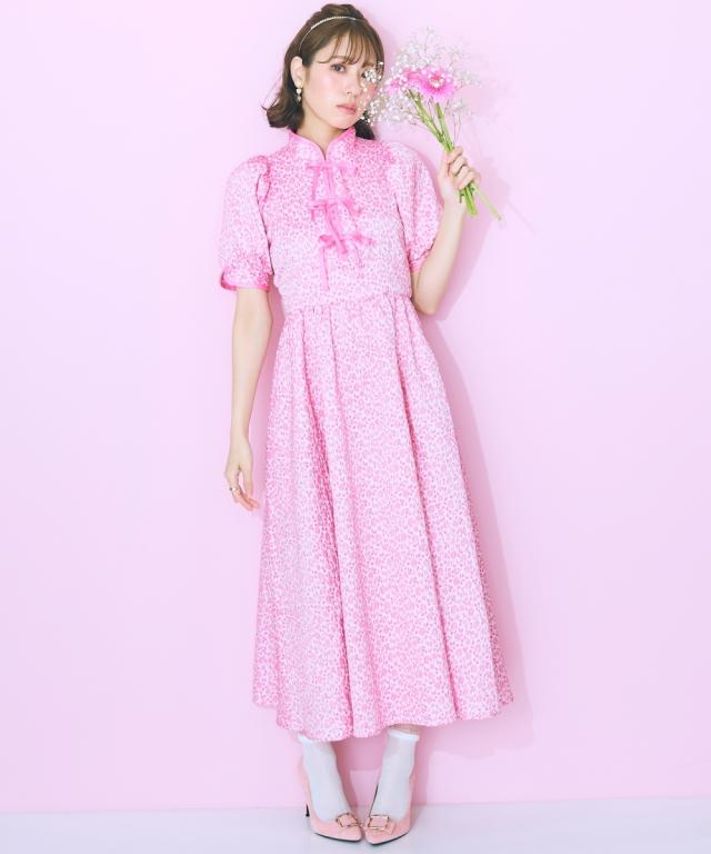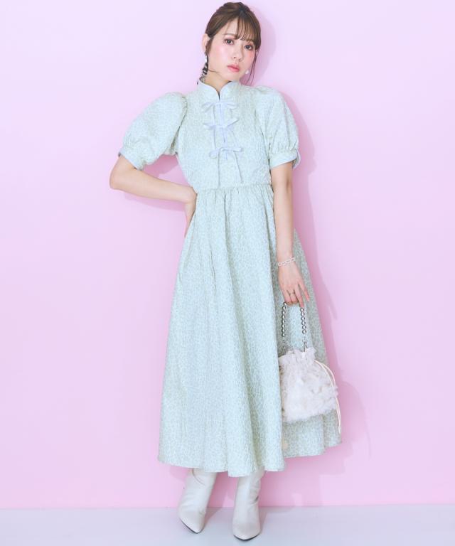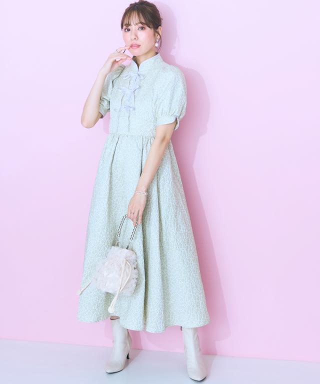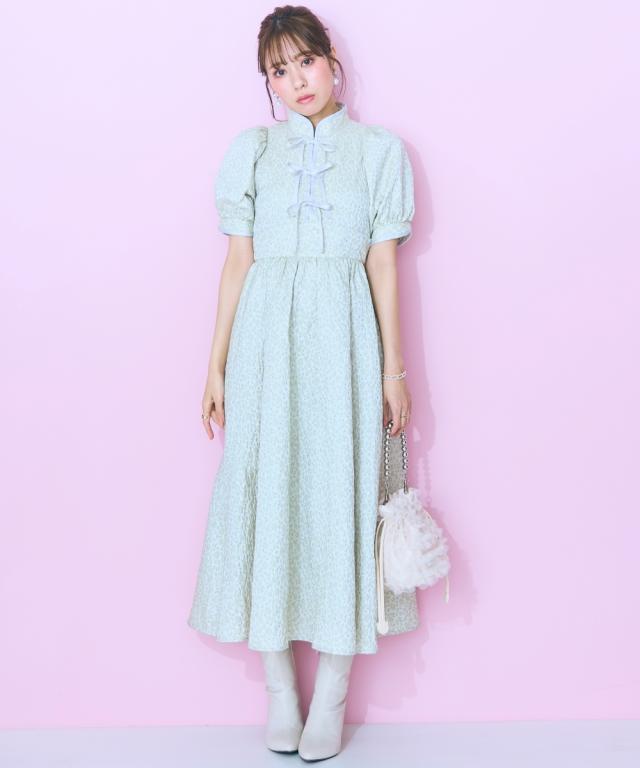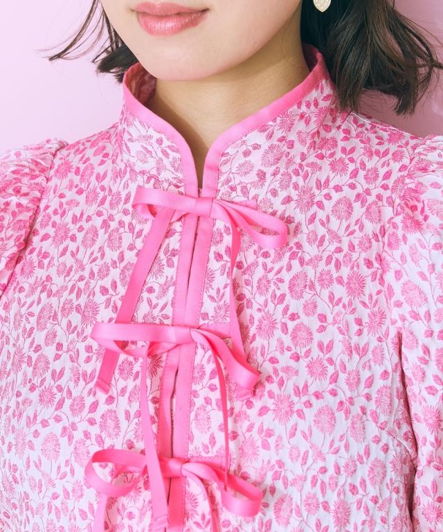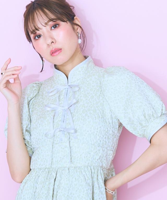フロントリボンデザインのチャイナテイストワンピース ■デザイン リボン&パイピングデザインが特徴的な花柄ワンピース。後ろゴム仕様です。フロント切り替えですっきり見える、ハイウエストデザイン。リボンはほどける仕様になっています。リボンがほどけても中が見えないよう、内側にスナップボタンをつけています。ビビッドな配色のピンクと落ち着いたグリーンの2色展開です。 ■素材 花柄が立体的に見える、しっかりした微光沢ジャガード素材を使用しました。リボンは光沢控えめのサテンリボンを使用しています。