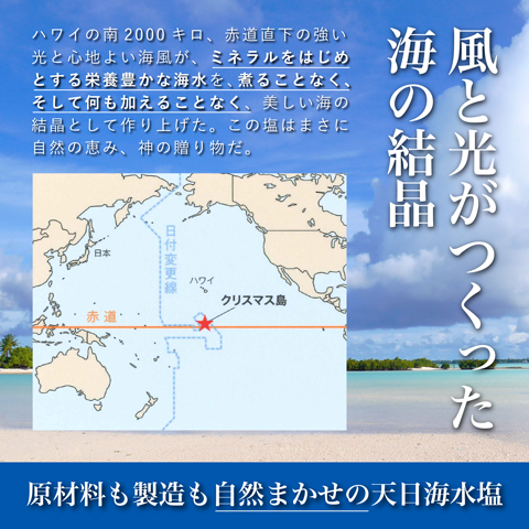 地上最後の楽園と言われる“クリスマス島”は、ハワイから南に2,000キロ、赤道直下の島キリバス共和国の島々の一つで、サンゴ礁でてきた世界で最も大きな島です。北極海と南極海から流れ込んだ深層水がぶつかり合い、初めて空気に触れる場所が「クリスマス島」近くの海域。その海水をサンゴ礁でできた塩田に引き込み、3ヶ月もの期間をかけてゆっくりと風に吹かれ、太陽の強い光を浴びながらじっくりと水分の蒸発を待ちます。