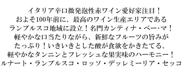 ルナート ランブルスコ ロッソ デッレミーリア セッコ カンティーナ ベ マ イタリア エミリア 赤 微発泡 中重口 辛口 Alc10.5%