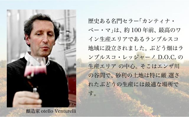 イタリア辛口微発泡性赤ワイン愛好家注目! およそ100年前に、最高のワイン生産エリアである ランブルスコ地域に設立!名門カンティナ・ベー・マ! 軽やかな口当たりながら、新鮮なフルーツの旨みが たっぷり!いきいきとした酸が食欲をかきたてる、 軽やかなタンニンとフレッシュな果実味のハーモニー! ルナート・ランブルスコ・ロッソ・デッレミーリア・セッコ