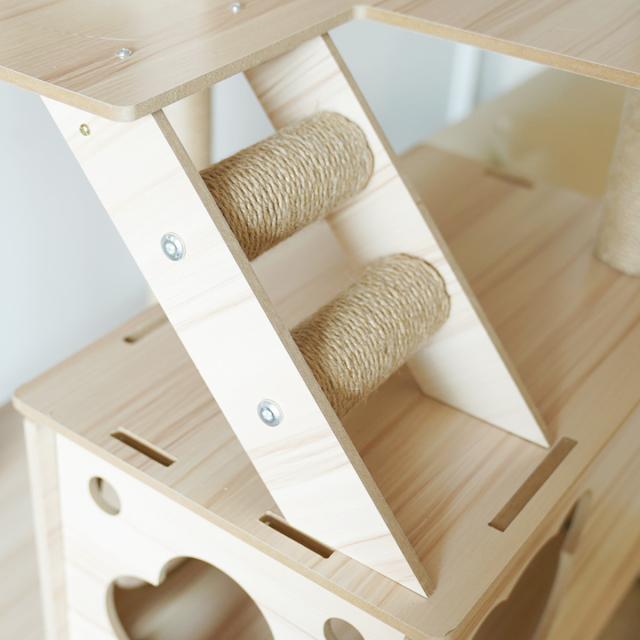 180cmを超える高さでも耐えられるように、材質にもこだわり、設計されたキャットタワーです。頑丈な作りで元気なネコちゃんの動きにも耐えられ、4本柱なので安定感があります。
