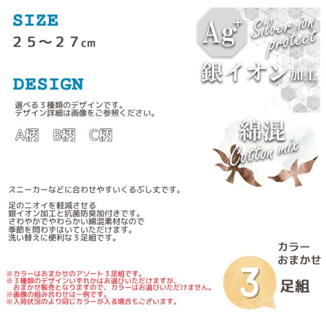 靴下 メンズ くるぶし Ag+ 消臭 スニーカー丈 おまかせ3足組 送料無料 スニーカーソックス くるぶしソックス 紳士靴下 まとめ買い 3足 消臭靴下 銀イオン加工 ニオイ対策 綿混 25cm 26cm 27cm(06361)