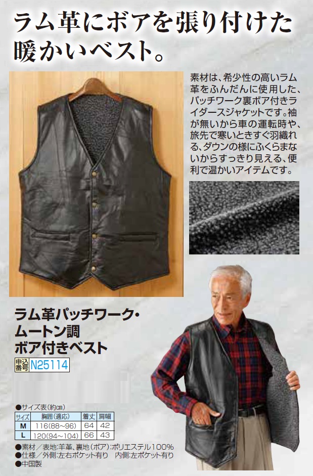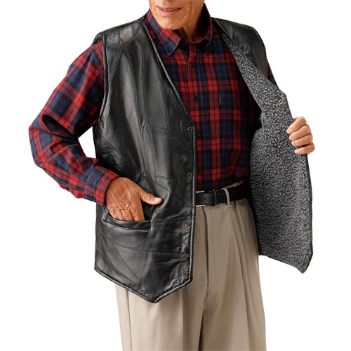 ラム革パッチワーク・ムートン調ボア付きベスト ブラック レザーベスト 革ベスト 前開き メンズ 紳士服 シニア 男性 黒 ラムレザー 裏ボア 防寒 無地 シンプル チョッキ シニアファッション 40代 50代 60代 70代 80代 父の日 お父さん おじいちゃん 敬老の日 秋冬