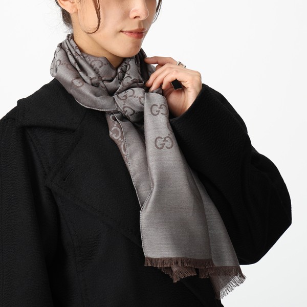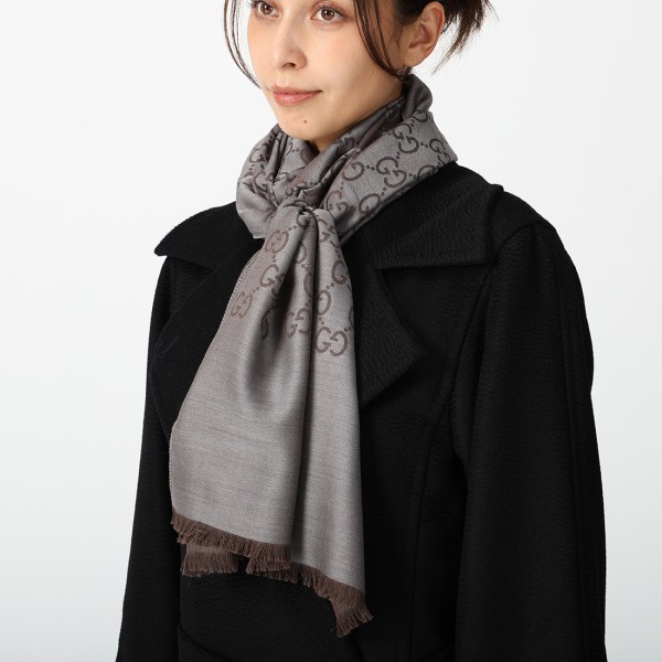 GUCCI(グッチ)のストールが入荷しました☆大人らしいリッチな雰囲気が漂うストール。ブランドお馴染みのGGロゴを全体にあしらい、アクセントを加えました。チクチクしないなめらかな肌触りも嬉しいところ。寒い時にサッと肩に羽織ったり、ひざ掛けとしてもお使いいただけます。