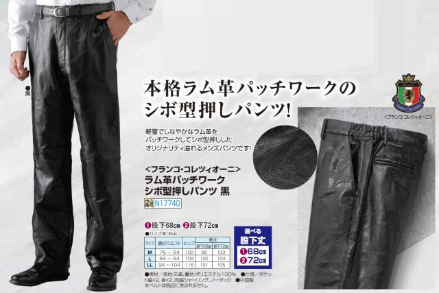 フランコ・コレツィオーニ ラム革パッチワーク柄押パンツ 黒 選べる股下丈 裾上げ済み レザーパンツ ブラック 革パン ボトム ズボン メンズ 紳士服 シニア 男性 ワイルド ラムレザー シニアファッション 40代 50代 60代 70代 80代 父の日 お父さん おじいちゃん 敬老の日 秋冬