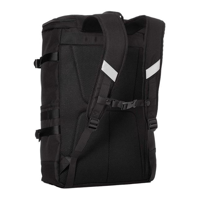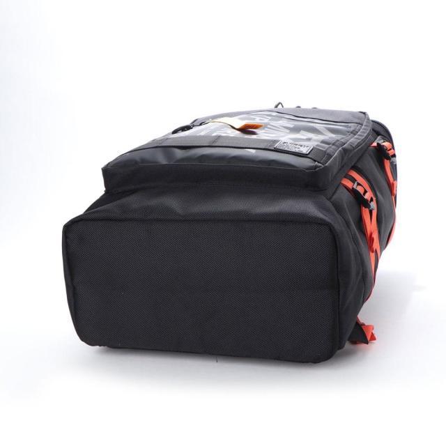 前面ポケット部分にはターポリンを使用しており、水や汚れにも強い仕様です。メインルーム背面にタブレット用クッションポケット装備。外側のサイドポケットにはペットボトルや折り畳み傘なども収納可能です。背面サイドにもメインルームにアクセスできるファスナー付きで小回りの利くボックスリュックです。生地にはターポリンと撥水加工を施したポリエステル生地を使用。定番のミリタリーをターポリンでタウンユースに落とし込み、撥水加工を施した生地で雨に強くタフな仕上がりにしあげたアイテムです。