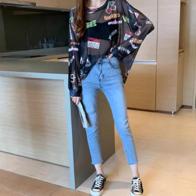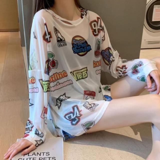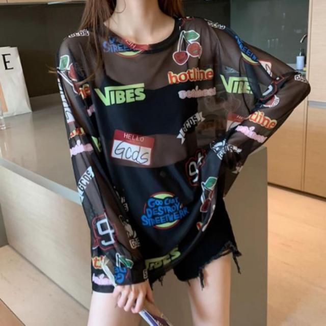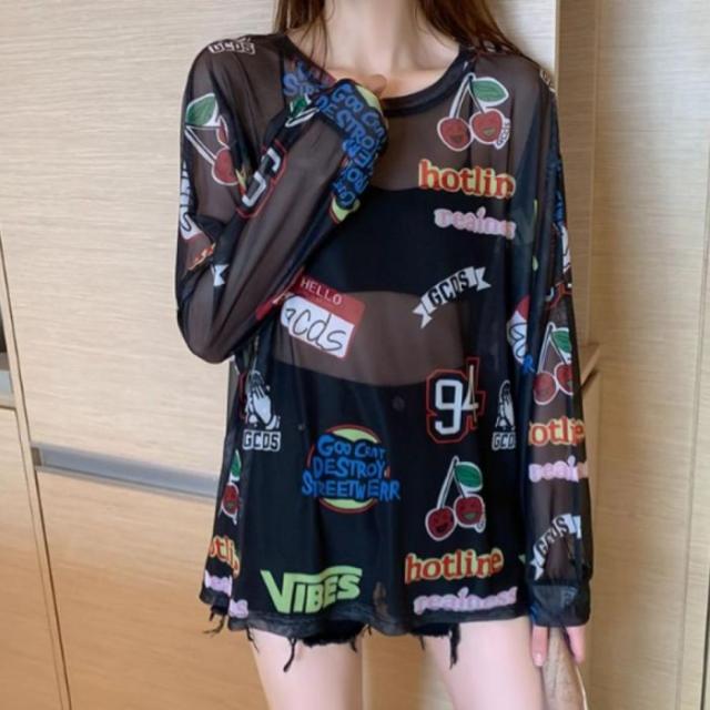 シアー トップス 長袖 透ける ロゴ 総柄 オーバーサイズ ゆる レディース 韓国ファッション ギャル ユニーク インナー 重ね着 ガチャガチャ 柄