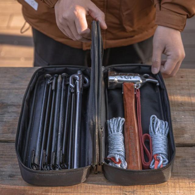 | 製品概要 | ペグ・ハンマー・小物をまとめて収納可能 ミニタリ—でおしゃれなペグケース 前面に軍用MOLLEシステム搭載、カラビナを通せるので使い方は自由自在 |