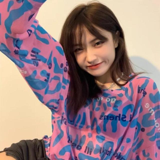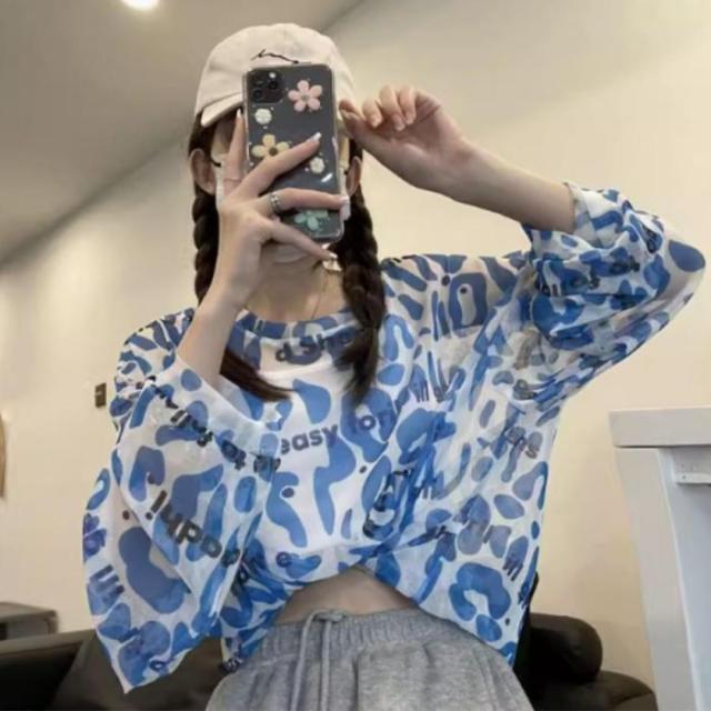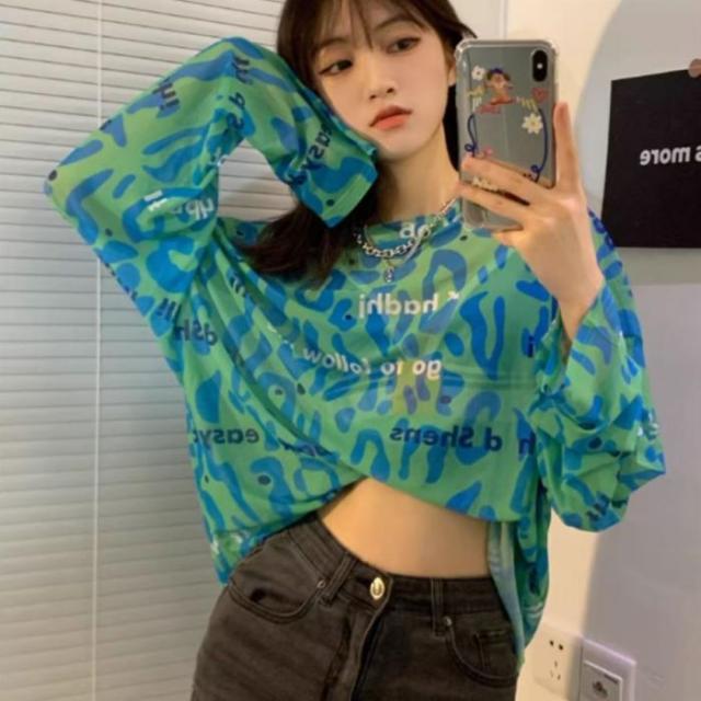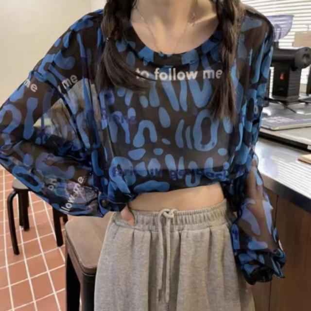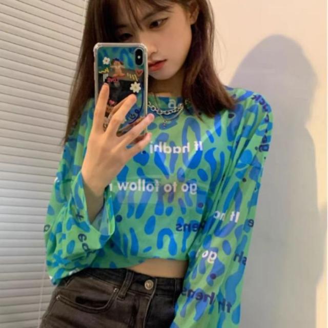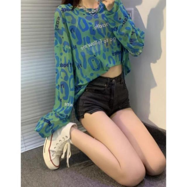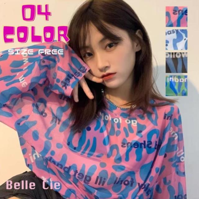 シアー トップス 長袖 透ける ロゴ 総柄 オーバーサイズ ゆる レディース 韓国ファッション ギャル ユニーク インナー 重ね着 レオパード 柄