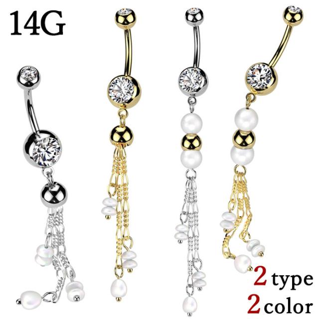 ヘソピアス 14G バナナバーベル ロングチェーン パール ジュエル CZ ジュエリー ボディピアス316L サージカル ステンレス