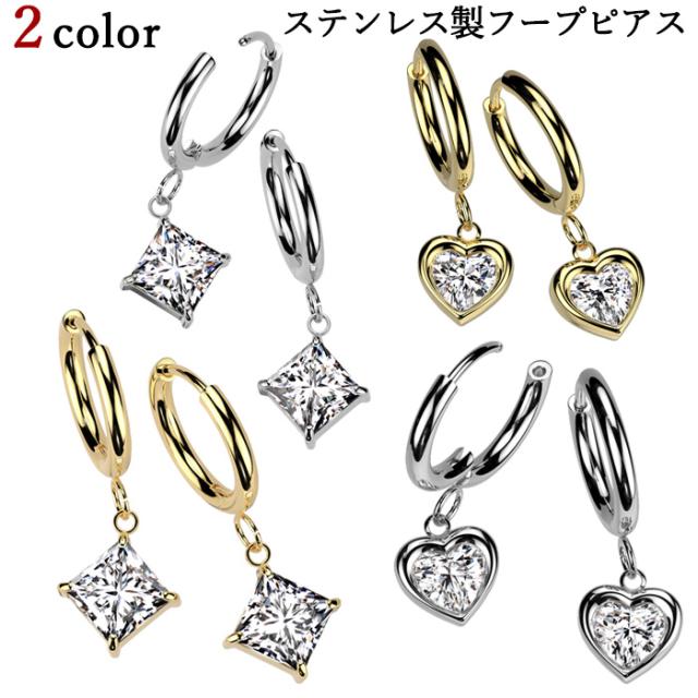 フープピアス サージカルステンレス ジュエル ハート & ダイヤ ダングル リングピアス 両耳用 1ペア 2個セット 両耳用 メンズ レディース
