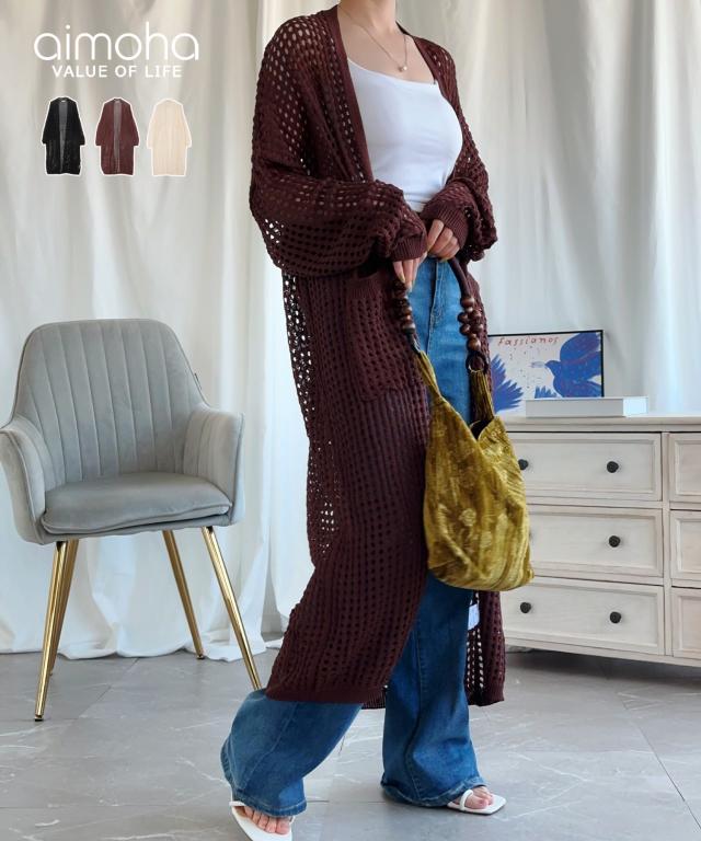 季節の変わりめに!!透け編み綺麗なロング丈カーディガン レディース 夏 春 秋 透け感 シアー ガウン カーディガン アウター ざっくり編み