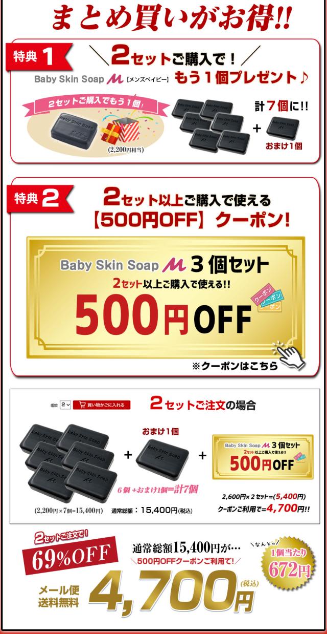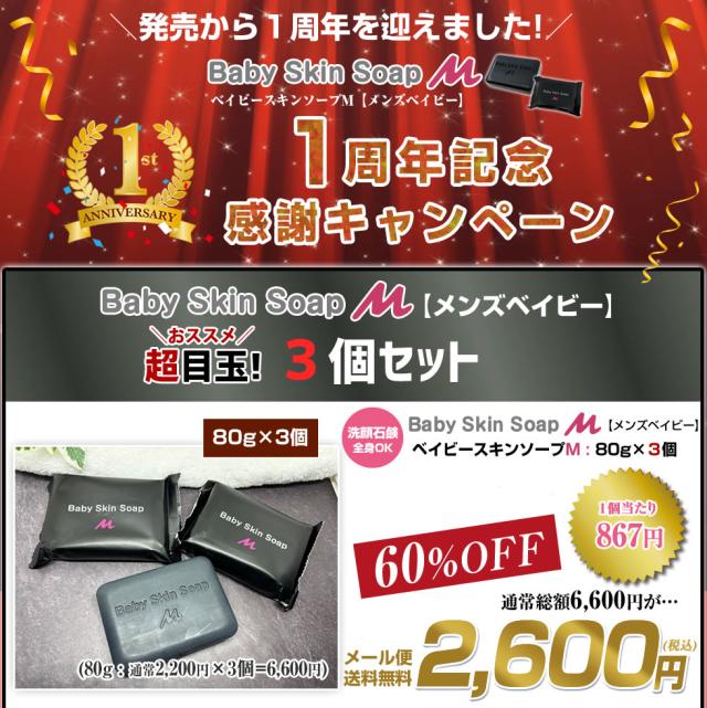 ★メンズベイビー1周年記念★\超目玉 60%OFF/ベイビースキンソープM【洗顔石鹸80g×3個】★2セットでもう1個+500円OFFクーポン⇒【1個あたり672円に】【メール便】送料無料※女性にも人気※ 肌の悩み・頭皮ケアに★加齢臭・汗臭を除去 洗顔 石鹸 ニキビ予防 イチゴ鼻