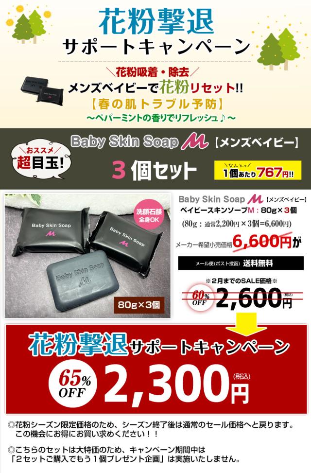 【花粉撃退サポートキャンペーン】\超目玉 65%OFF/ベイビースキンソープM【洗顔石鹸80g×3個】【メール便】送料無料※女性にも人気※ 肌の悩み・頭皮ケアに★加齢臭・汗臭を除去 洗顔 石鹸 ニキビ予防 イチゴ鼻 花粉