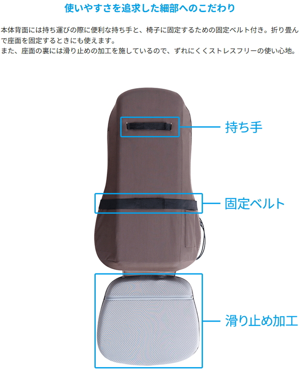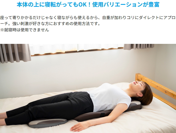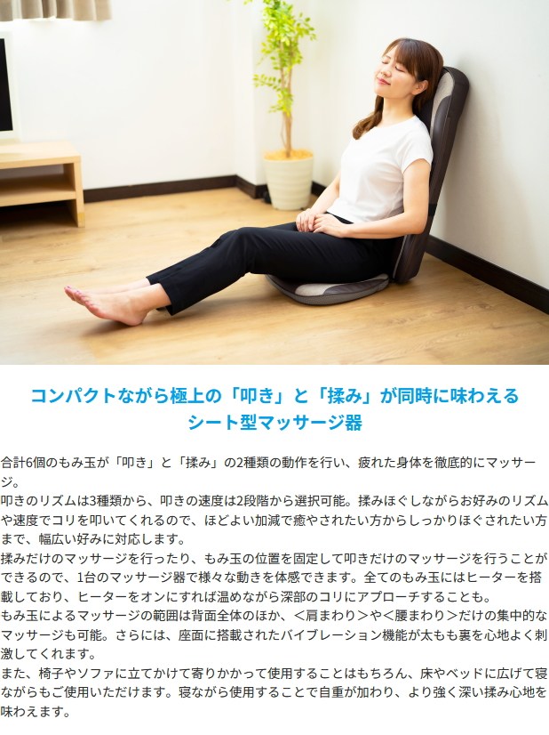 コンパクトながら極上の「叩き」と「揉み」が同時に味わえるシート型マッサージ器。合計6個のもみ玉が「叩き」と「揉み」の2種類の動作を行い、疲れた身体を徹底的にマッサージ。叩きのリズムは3種類から、叩きの速度は2段階から選択可能。揉みほぐしながらお好みのリズムや速度でコリを叩いてくれるので、ほどよい加減で癒やされたい方からしっかりほぐされたい方まで、幅広い好みに対応します。揉みだけのマッサージを行ったり、もみ玉の位置を固定して叩きだけのマッサージを行うことができるので、1台のマッサージ器で様々な動きを体感できます。全てのもみ玉にはヒーターを搭載しており、ヒーターをオンにすれば温めながら深部のコリにアプローチすることも。もみ玉によるマッサージの範囲は背面全体のほか、肩まわりや腰まわりだけの集中的なマッサージも可能。さらには、座面に搭載されたバイブレーション機能が太もも裏を心地よく刺激してくれます。また、椅子やソファに立てかけて寄りかかって使用することはもちろん、床やベッドに広げて寝ながらもご使用いただけます。寝ながら使用することで自重が加わり、より強く深い揉み心地を味わえます。