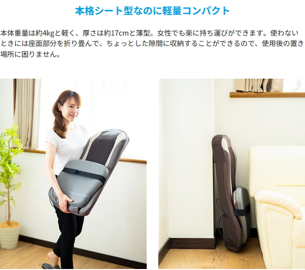 【商品サイズ(約)】幅457×奥行1143×厚さ170mm【商品質量(約)】本体/4kg【耐荷重】90kg以下【電源方式】電源コード【定格電源】AC100V 50/60Hz【本体定格】DC24 48W(電熱装置10W含む)【作動時間】タイマー15分自動オフ【表面最高温度(約)】40℃(ヒーター使用時【素材】●本体構造部分:ABS、POM、PP、PA66●張地:(表)PU、ポリエステル(裏)ポリエステル●座面裏:PVC、ポリエステル【セット内容】本体、ACアダプター、取扱説明書【保証期間】購入日より1年間【使用目的または効果】あんま、マッサージの代用。一般家庭で使用すること。【医療機器認証番号】306AKBZX00020000【区分】中国製・医療機器【メーカー】株式会社ヴァルテックス