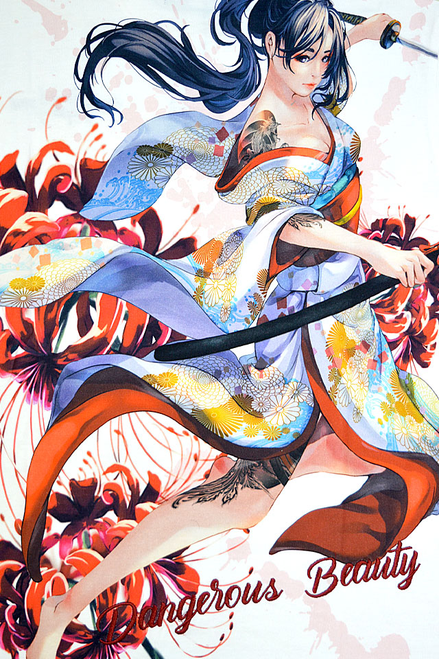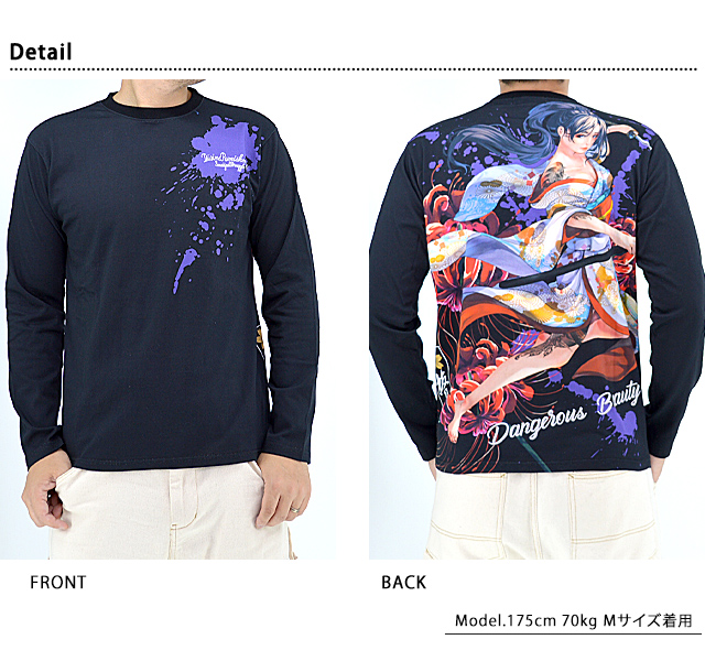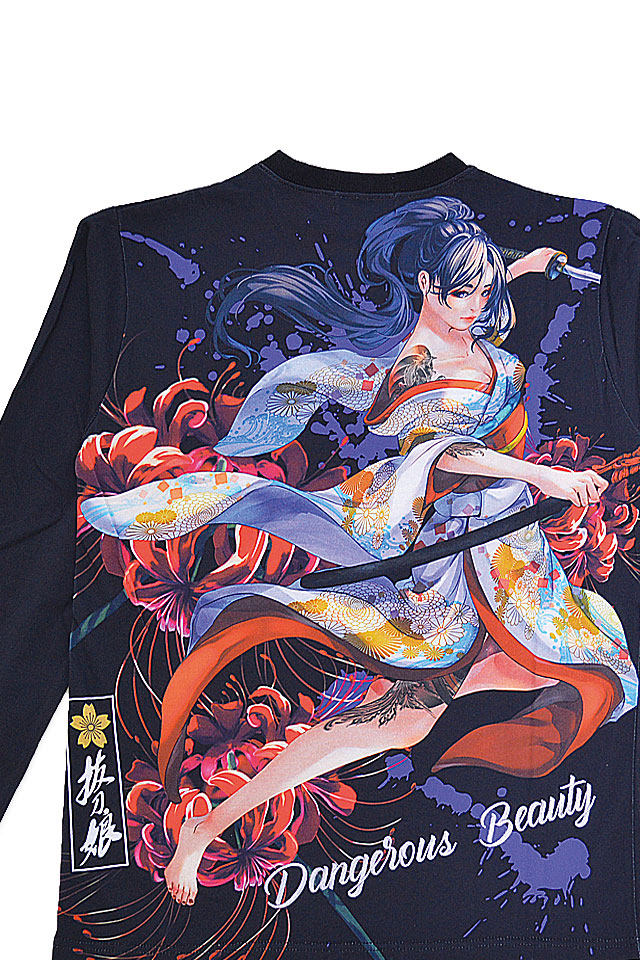 絡繰魂の姉妹ブランドとして誕生した、従来の和柄から抜け出し、和の持つ美しさを融合させた【抜刀娘】から「抜刀娘 【美麗】 妃那 華の舞長袖Tシャツ(243892)」のご紹介です。 今回はいつもの抜刀娘デザインとは一味違う! モチーフの主役に採用されたのは美しい妃那。 ボディーには、通常よりやや薄手な生地を採用。 | |||||||||||||||||||||||||