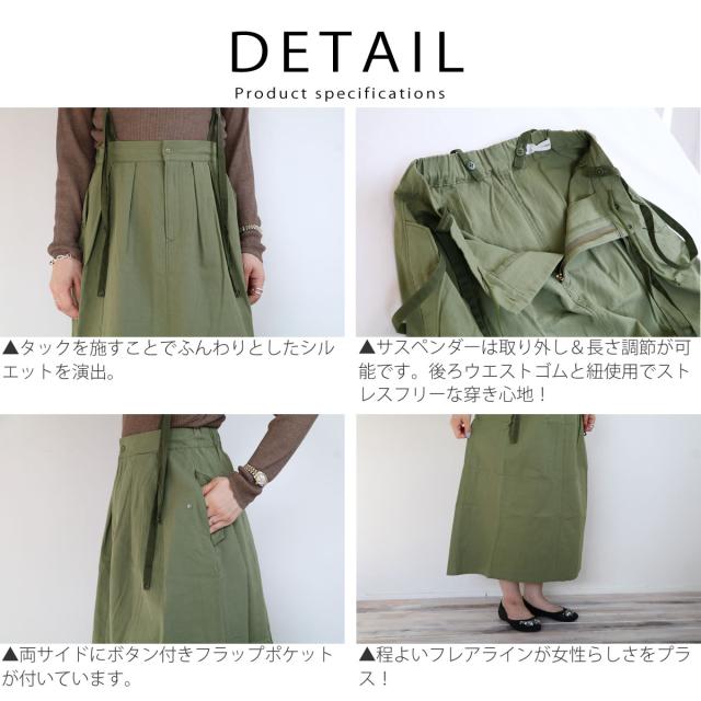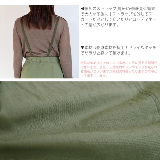 ストラップを外してロングスカートだけとして穿いたりとコーディネートの幅が広がります。