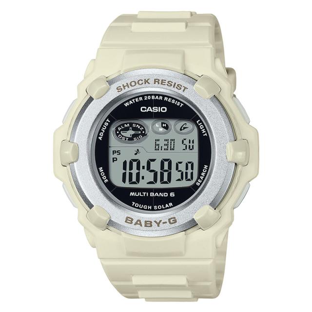 アクティブな女性のためのカジュアルウオッチBABY-G。季節を問わず幅広いファッションに合わせやすいシンプルな薄型ラウンドフェイスのデジタルモデルです。