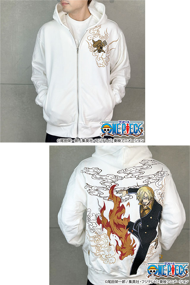 絡繰魂のONE PIECE コラボより新作登場!! コラボ限定描き下ろしの超貴重なデザインを今回はパーカーに落とし込み!! 背景には悪魔風脚で燃える業火をプリント!!ブランドロゴにも引火する演出!! タバコの煙をなびかせながら、今にも蹴り上げるサンジは大迫力! サンジ限定「コックのピスネーム」が裾横に付属。 サンジの勇ましさを存分に表現した一着です! | |||||||||||||||||||||||||