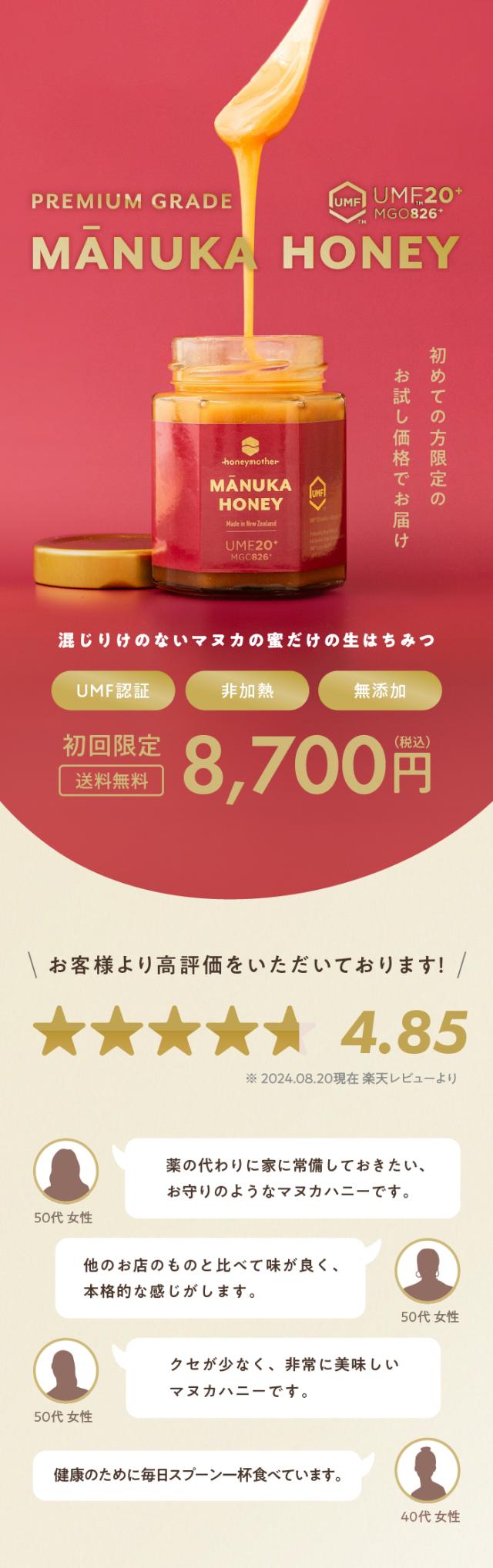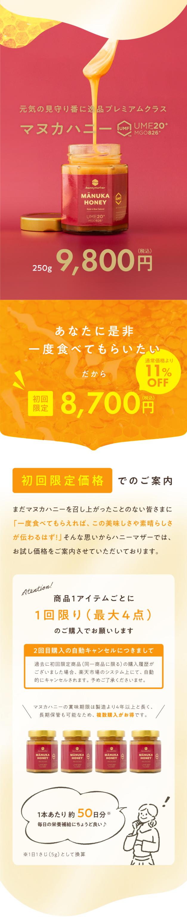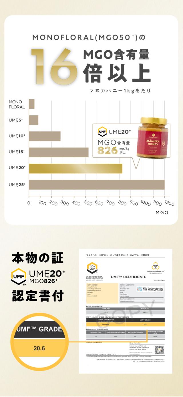 マヌカハニー UMF 20+ 250g 【 初回限定価格 & 送料無料 】 はちみつ ハチミツ 蜂蜜 非加熱 マヌカはちみつ ( MGO826+)