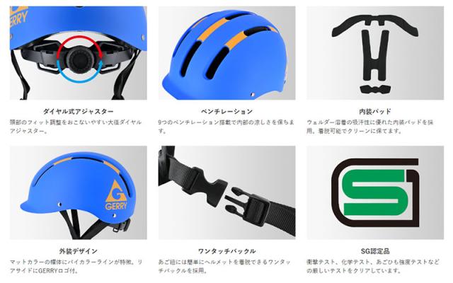 クロスバイクや小径車に乗る方にも抵抗のないシンプルな形状のシェルに、人気アウトドアブランド「GERRY」のロゴデザインが施されたキッズ向け自転車用ヘルメット。カラーはマットピンク、マットブルー、マットブラックの3色展開。鮮やかなバイカラーラインが特徴。走行遊具などの使用にも適した、頑丈なハードシェルタイプ。安心のSGマーク認定品。
