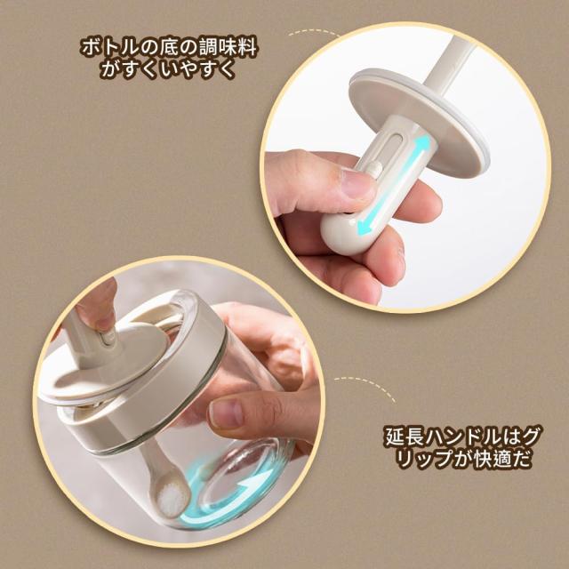 【可伸縮なスプーン付き】これはフタとスプーンが一体になっているスパイスボトルで、スプーンの長さは自由に無段階に調節できるので、ボトルの底にいる調味料も簡単にすくうことができるし、塩をいっぱい入れても蓋をしっかりとすることができます。