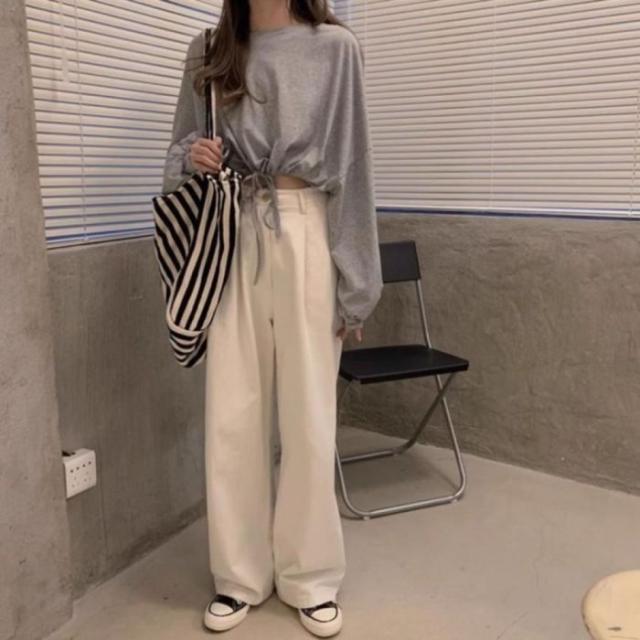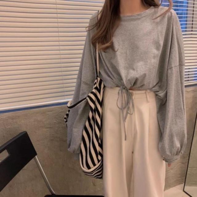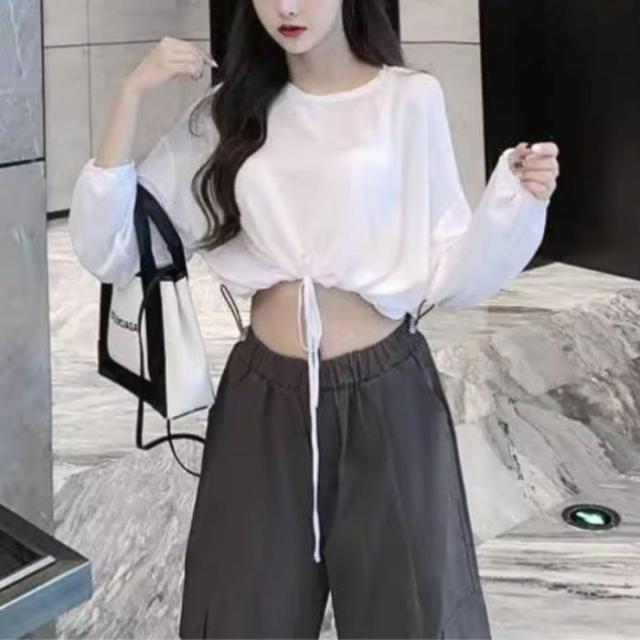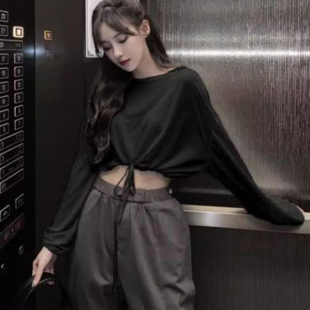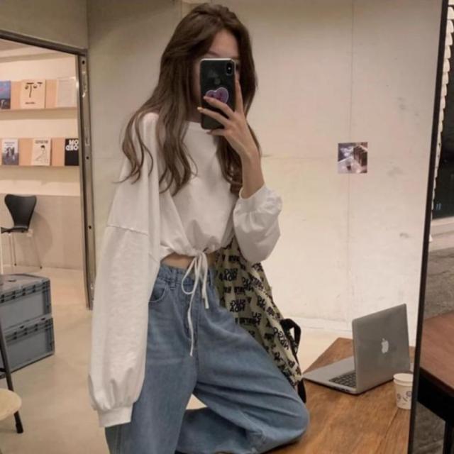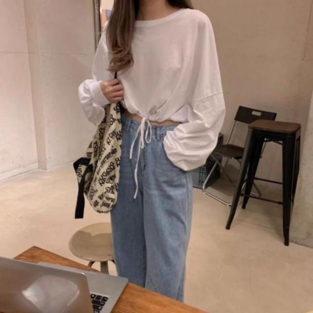 Tシャツ ロンT 長袖 ショート丈 短丈 ドロスト トップス 無地 レディース 韓国ファッション シンプル かわいい 裾絞り ストリート モノトーン
