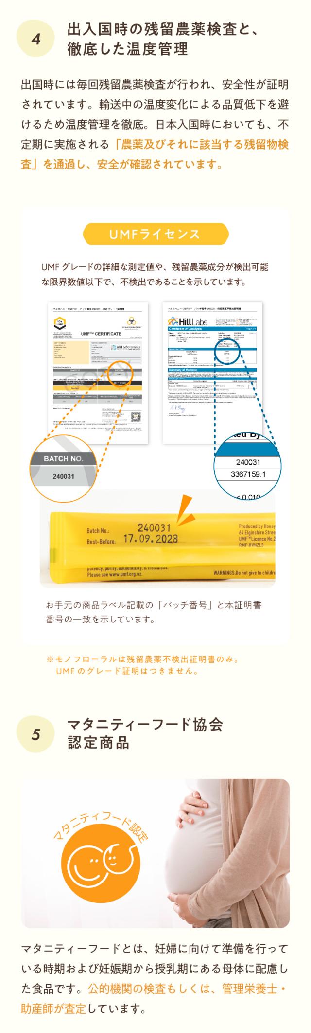 マヌカハニー特有の成分であるメチルグリオキサールなどの含有量を表すグレードはUMF10+(MGO260+に相当)。